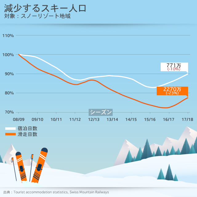 スイスのスキー人口は全体的に減っている。18年にスイス観光業界が出した報告書によると、08/09年シーズンから17/18年シーズンの滑走日数は23%減少と、世界全体と同じ傾向を示した。スイス人研究者ローラン・ヴァナ氏は世界のスノースポーツ・山岳観光業に関する年次報告書でこう分析している。「欧米のスキー市場は横ばい傾向にある。しかしこれは世界的なスキー人口には反映されていない。中国のような新興市場のおかげで世界のスキー人口は増加しているためだ」