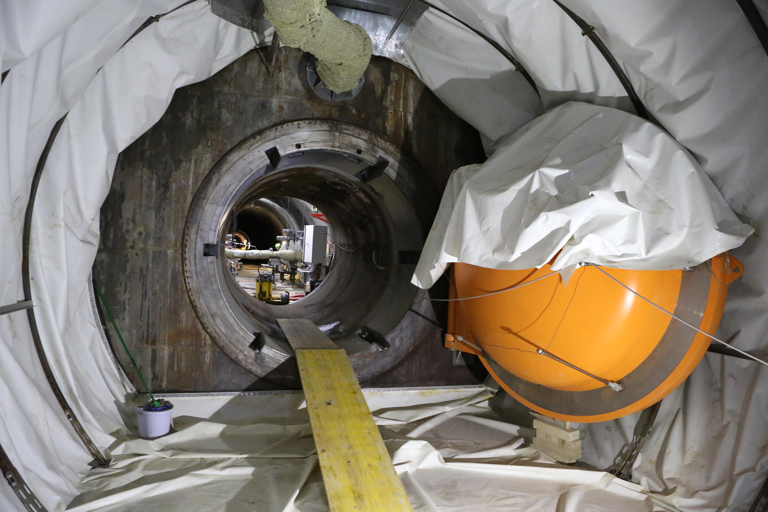 中央貯蔵室の奥行きは約100メートル。ここに33バールに圧縮された空気を貯蔵するが、これは水深300メートル地点に相当する圧力だ。そのため貯蔵室内部の作業はきわめて困難だという。設備監視用のビデオカメラにも、水中作業用の特別な機種が使われている。