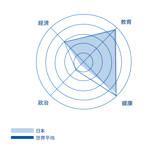 健康の分野は順位を上げて40位、教育の分野は中位の76位だが、経済の分野が118位で政治の分野が103位に位置づけられた。