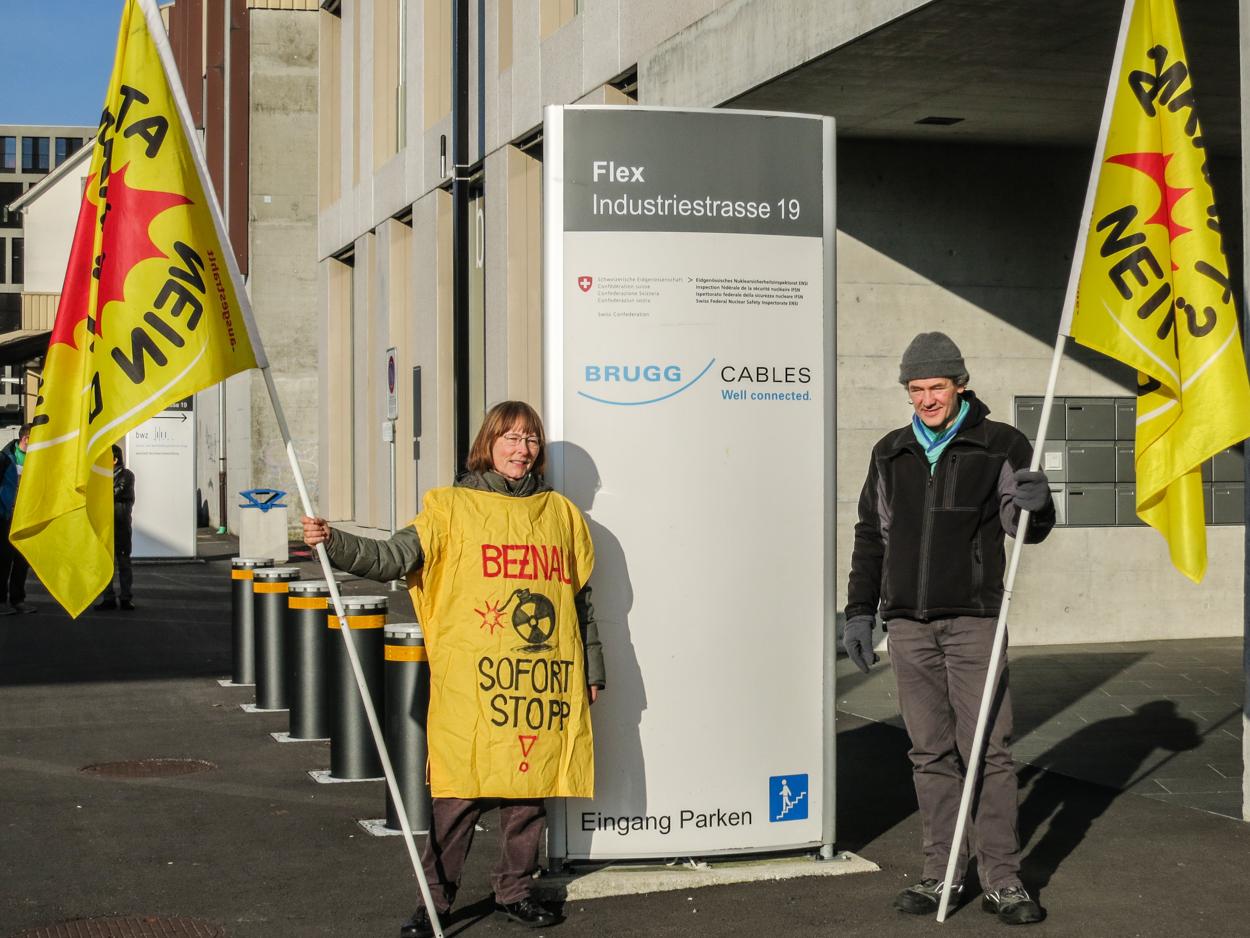 この日の華やかなイベントとは対照的に、グラウザーさんとその仲間が日ごろやっている活動は、とても「地味」だ。連邦核安全監督局(ENSI)が入っているスイス・ブルック駅前ビルの入り口横に、毎週月曜~木曜日のENSI職員が退出する夕方5時~6時に、ただ反原発の旗を持って立っているだけだ。