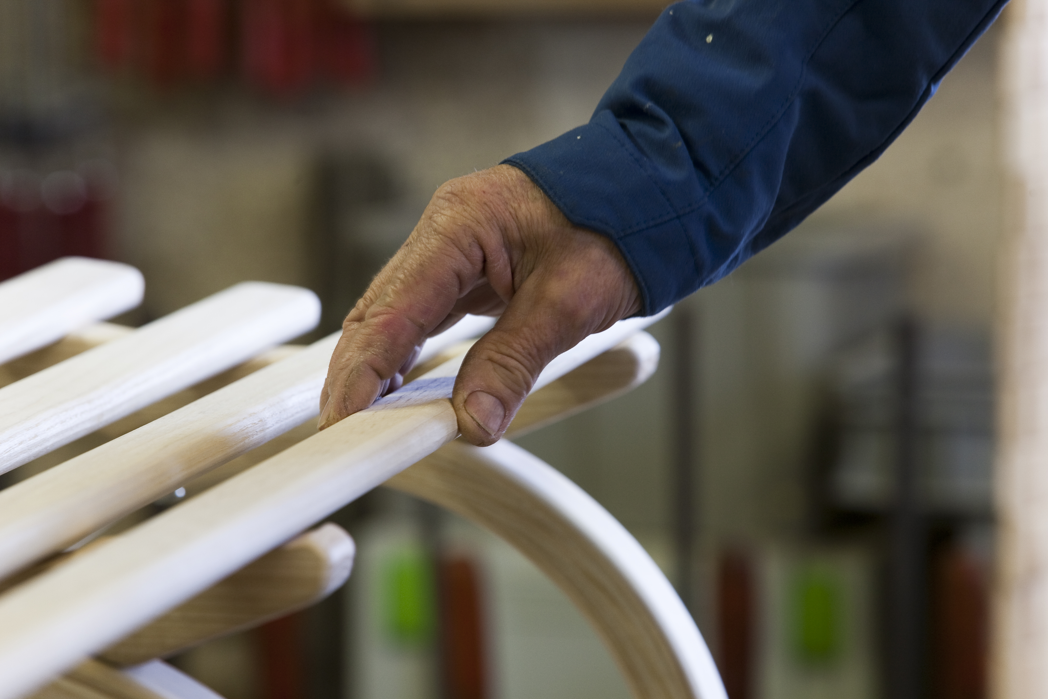 乾燥させた板は、工房で小さな部品に切り分けられ、その後、部品同士を接着したり、曲げたり、円形にカットしたり、穴を空けたりする一連の作業が行われる。冬になるとそれぞれの部品を組み立て、ソリやリュージュを完成させる。