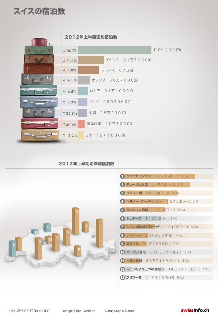 スイスに宿泊する外国人のなかで、伝統的に最も多いのがドイツ人。しかし、2012年上半期ではドイツ人宿泊数は明らかに減少している。一方、他の外国人の宿泊数は伸びている。