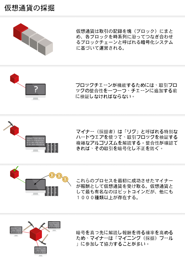 ここの仮想通貨の採掘場は、点滅する光と低い唸り声を上げるコンピューターサーバー、絡み合ったケーブルやパイプだらけの小さな部屋だ。複雑な数理学的問題を解いて仮想通貨の報酬を得ている(詳しくは下のグラフィックを参照)。