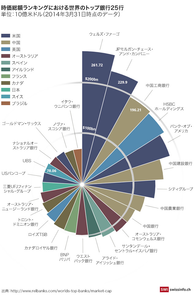 金融活動がスイス経済で極めて重要な役割を担っていることは明らかだが、国際的にスイスの金融機関はどのあたりに位置するのだろうか?次の図は、2014年の大銀行のトップ25行の時価総額を示したものだ。