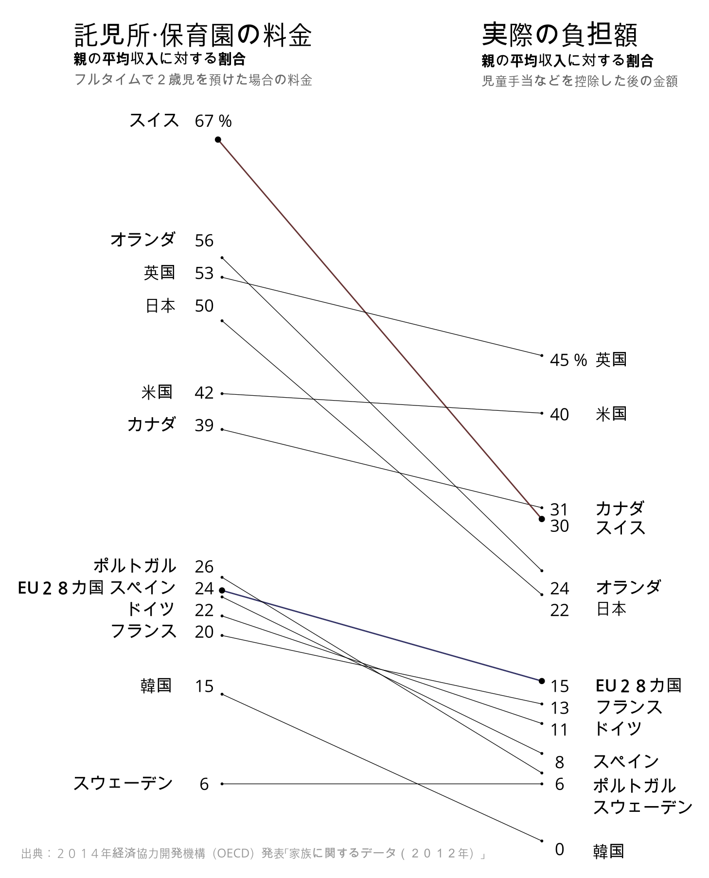 児童手当や税金控除などにより最終的な負担額は3割に減るが、それでも英国や米国に次いで高い。スイスでは9割が私立保育園で運営費の大半を保育料が占めるため、どうしても高くなりがちだ。
