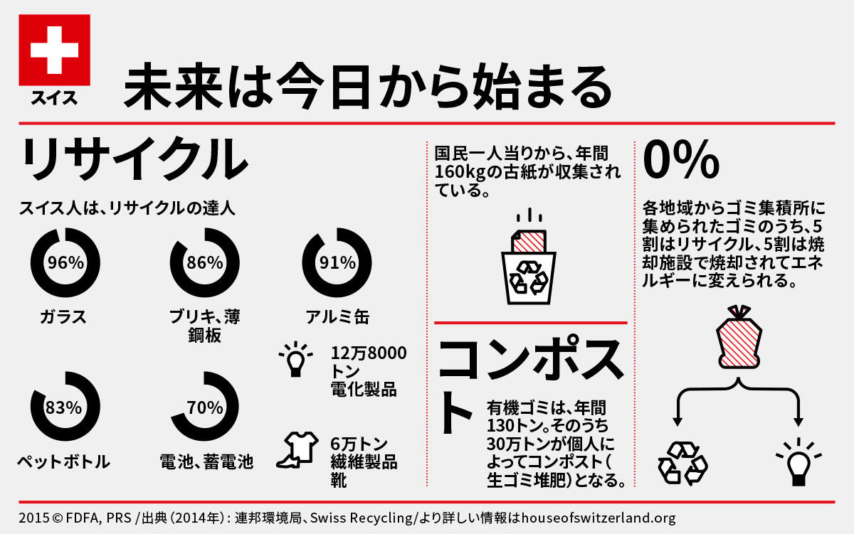 しかし、96%という素晴らしい数字ながらも、欧州ガラス容器連合(FEVE)が15年に発表した数字を見ると、スイスはデンマーク(98%)とスウェーデン(97%)をわずかに下回っている。アルミ缶のリサイクルについても同様で、12年に欧州アルミニウム協会が発表したデータによると、ノルウェー(96%)などいくつかの国がスイス(92%)より少し上となっている。