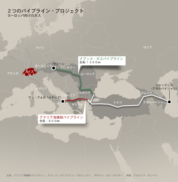 最終結果は今年6月発表の予定で、指名されたパイプライン事業者は、いよいよカスピ海域に埋蔵されている豊富な天然ガスを欧州に輸送できるようになる。その結果、数十億フラン(数千億円)の経済的効果が得られるだけでなく、スイスをはじめ、EUにとって重要な戦略となる南東を結ぶ新しい輸送路も確保できる。