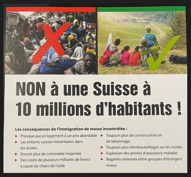問題になっているのは、国民党が展開する「人口1000万人のスイスにノー」運動の一環で国内全世帯に配布されたチラシだ。9月中旬に撮影された伊ランペドゥーザ島で待機するアフリカ系移民の写真に赤いバツ印をつけ、スイスの田舎に暮らす家族の姿と対比させたものだった。