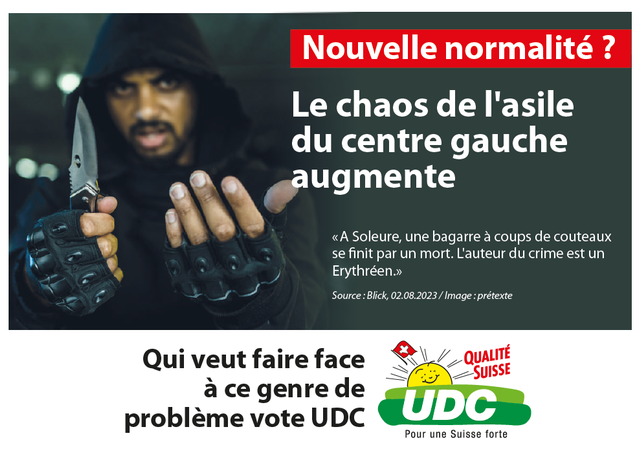その他の選挙広報物も物議を醸している。難民政策と治安悪化の因果を想起させる「ニューノーマル(新常態)?」と題したポスターもその1つだ。「難民による混乱」への嫌悪感を煽るスローガンとともに、外国人による暴行事件を思わせるような武器を振り回す男性の写真を使ったものだ。