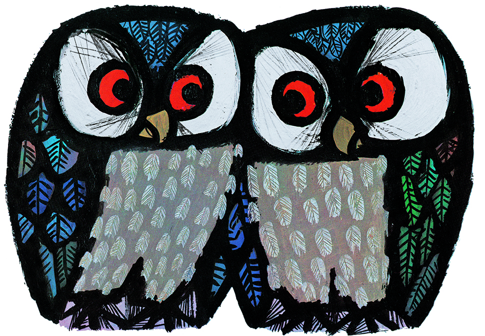 ピアッティの世界では、フクロウは賢く、温和で、親切な存在。それは、ピアッティが重要視していた性質です。まず、彼らを他の鳥類とは異なった存在にしているフクロウの顔には、まさに人間のように表現したくなる趣があります。そして、ピアッティのフクロウを見ると、真っ先にその大きな目と見透かすようなまなざしに目がいきます。グラフィックデザイナーとしても、芸術家としても、確実にピアッティは「見る」という行為が仕事と生活で重要な役割を持つ、視覚型の人間でした。フクロウのモチーフの解明とは、自分自身、また世界における自己の役割の解明であり――すなわち、答えの出ないことを解明しようとすることだと、私は考えています。