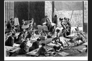 さて、寺小屋の挿絵を美術的に眺めると、前述の大道芸人の挿絵で見たように、机に伏せて眠る子どもや外で遊ぶ子どもなど、別々の絵が一つの挿絵の中に集められ「想像し、再構成された寺小屋」になっている。