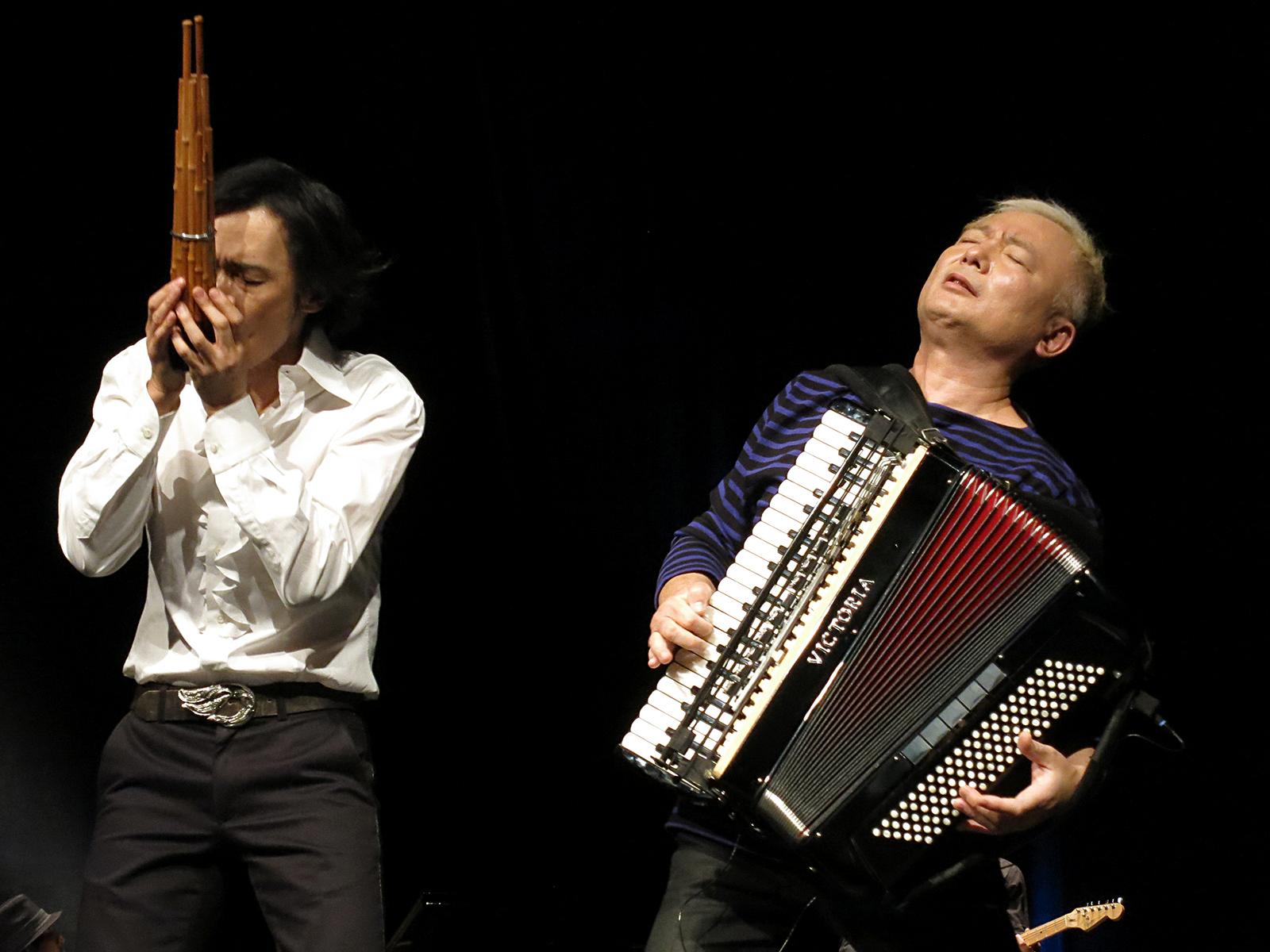 両手に包まれた超小型のパイプオルガンのような笙も、サウンド・オブ・ミュージックの「私のお気に入り」の曲を奏ると、そのきらめくような多様な音に会場は静まり返る。そこにcobaさんのアコーディオンが入り、その音色を継承する。「二つの楽器がマッチするのは当然。笙はアコーディオンの元祖だから」と、演奏後に東儀さんが説明する。笙の原型は2千年以上も前に東南アジアで生まれシルクロードを経てヨーロッパに伝わりダブルリード楽器を生み、そしてアコーディオンが生まれた。