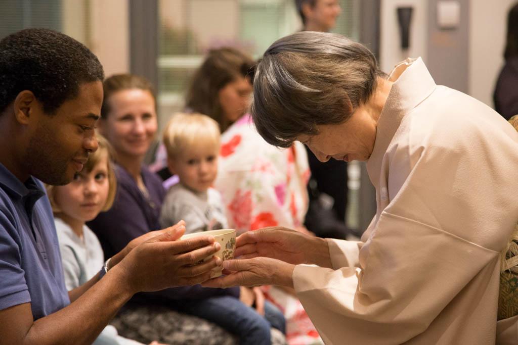 別室で1日数回行われていた茶道実演は毎回満席だ。はじめは差し出された抹茶茶わんをこわごわと受けとっていた子どもも、着物姿の女性の笑顔にほっとし、新しい文化との出会いに顔をほころばせる。
