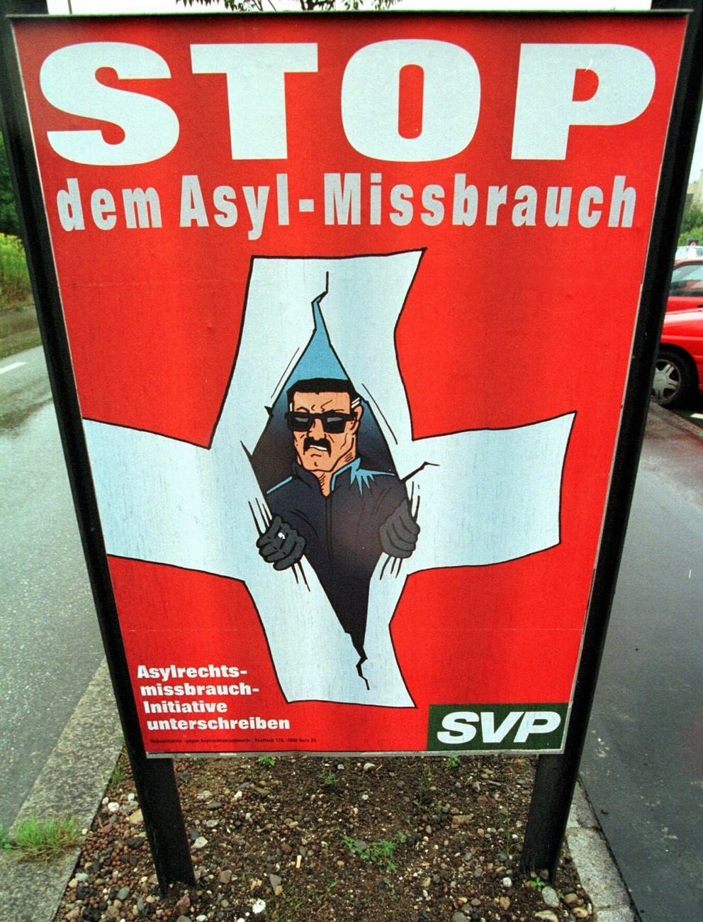 1990年代に入ると、保守右派の国民党がこの区別を巧みに取り上げ、難民の新しいイメージを普及させた。国民党は難民を第一に庇護を必要とする人たちとして捉えるのではなく、不正にスイスに滞在しようとする人々としてキャンペーンを展開した。冷戦時代の典型的な難民とは暴力的な共産政権から迫害された人々を指したが、89年以降は「難民希望者」が共産主義者に代わって「恐怖の存在」となった。難民に関するステレオタイプは麻薬の売人、ごろつき、犯罪者だった。
