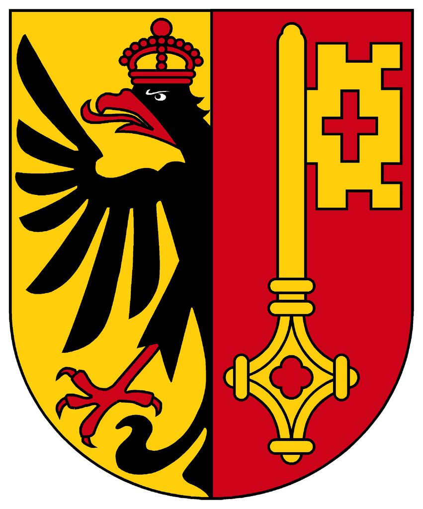 州旗 左が黄色、右が赤で2等分されている。左には赤い王冠をかぶり爪が赤い黒いワシ、右には黄色い鍵が描かれている。鍵は聖ペトロを象徴し、聖ペトロがジュネーブ大司教区と教会をまとめるという意味。ワシは皇帝のシンボルであり、ジュネーブの領主もワシを旗に使うことが許されていた。