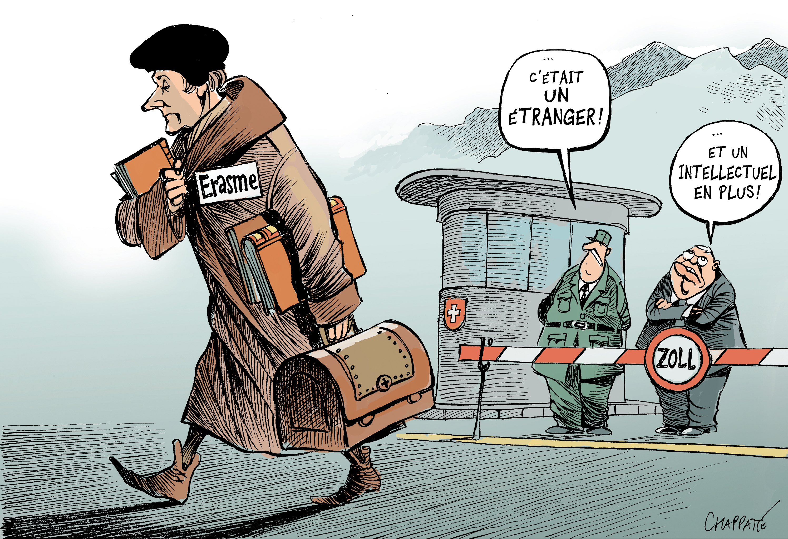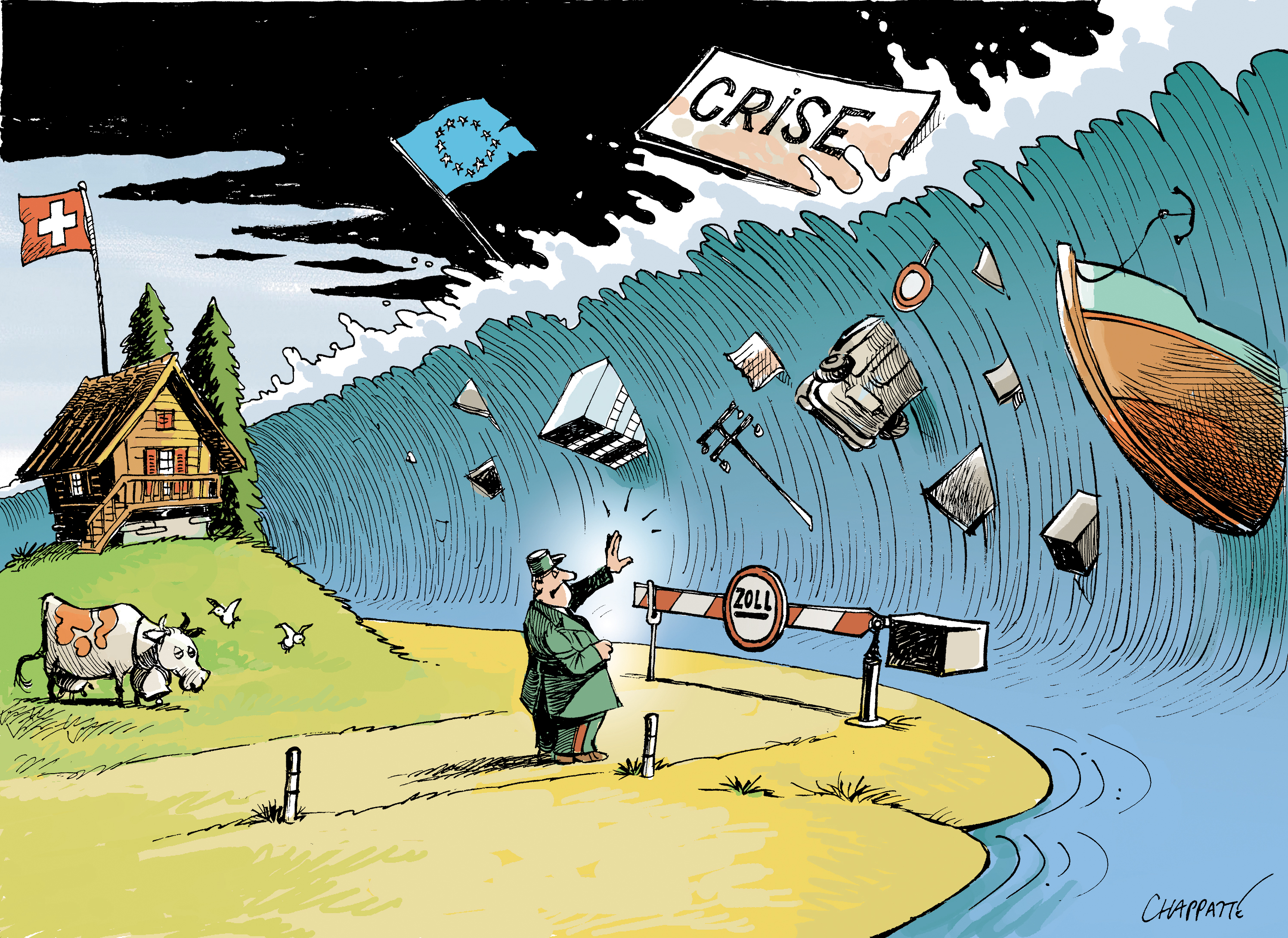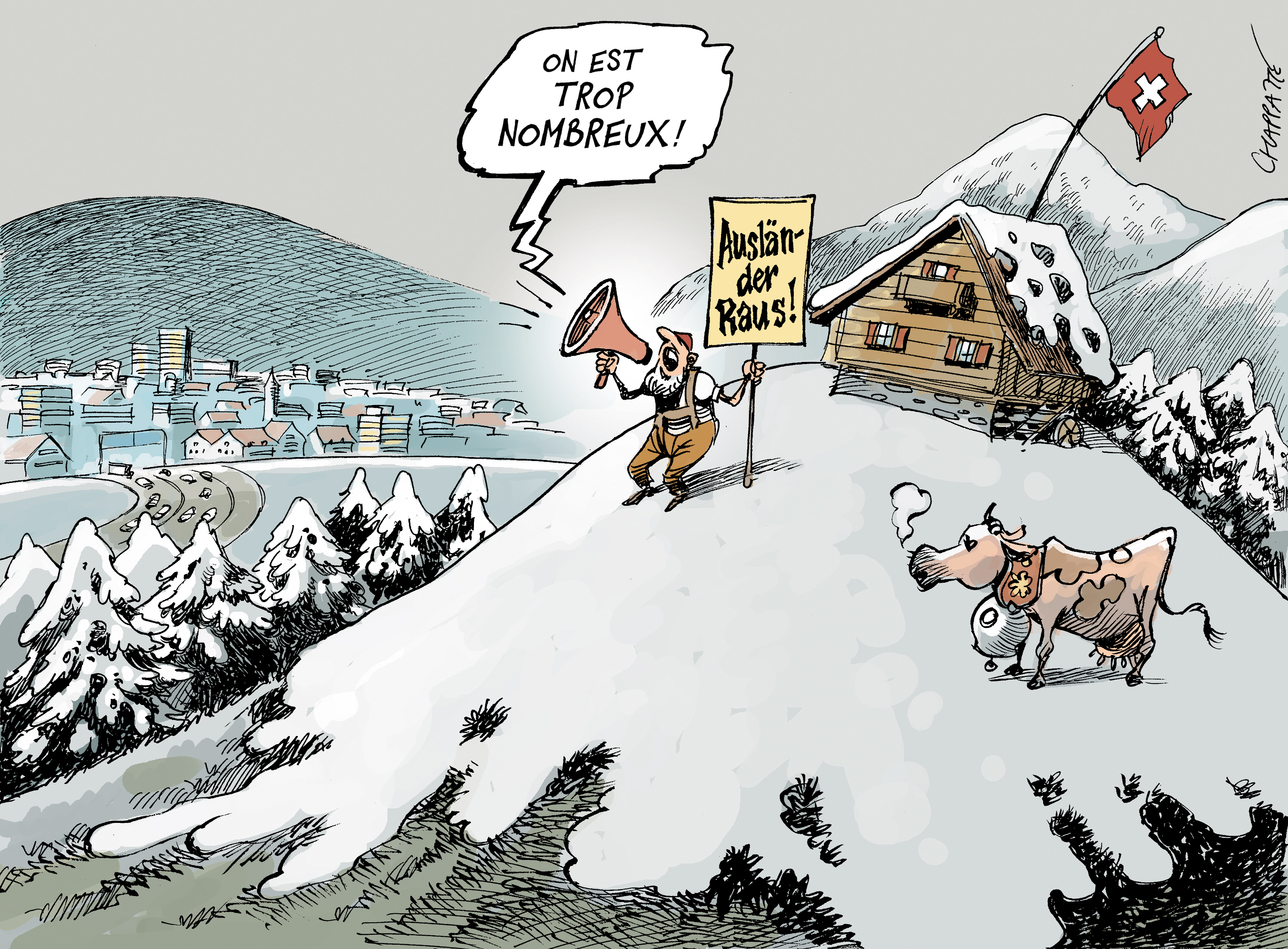 「欧州が私たちを包囲している!隣国からスイスに通勤してくる外国人が大勢いる!外国人のせいで満員電車だ!」。1992年から2014年までの作品120点以上を集めたシャパットの新刊の裏表紙にそう書かれている。テーマの中心はスイス、外国人、欧州。さらに、保守的なことで有名な政治家クリストフ・ブロッハー氏とその所属政党の国民党も題材によく使われる。