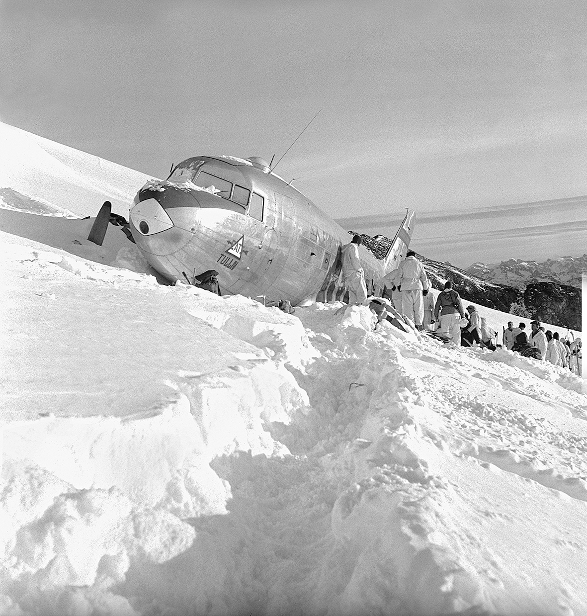 ダコタC53は1946年11月19日、霧の中でコースを見失い、ベルナーアルプスのガウリ氷河(3350メートル地点)に不時着。飛行機が発見されたのは偶然だった。