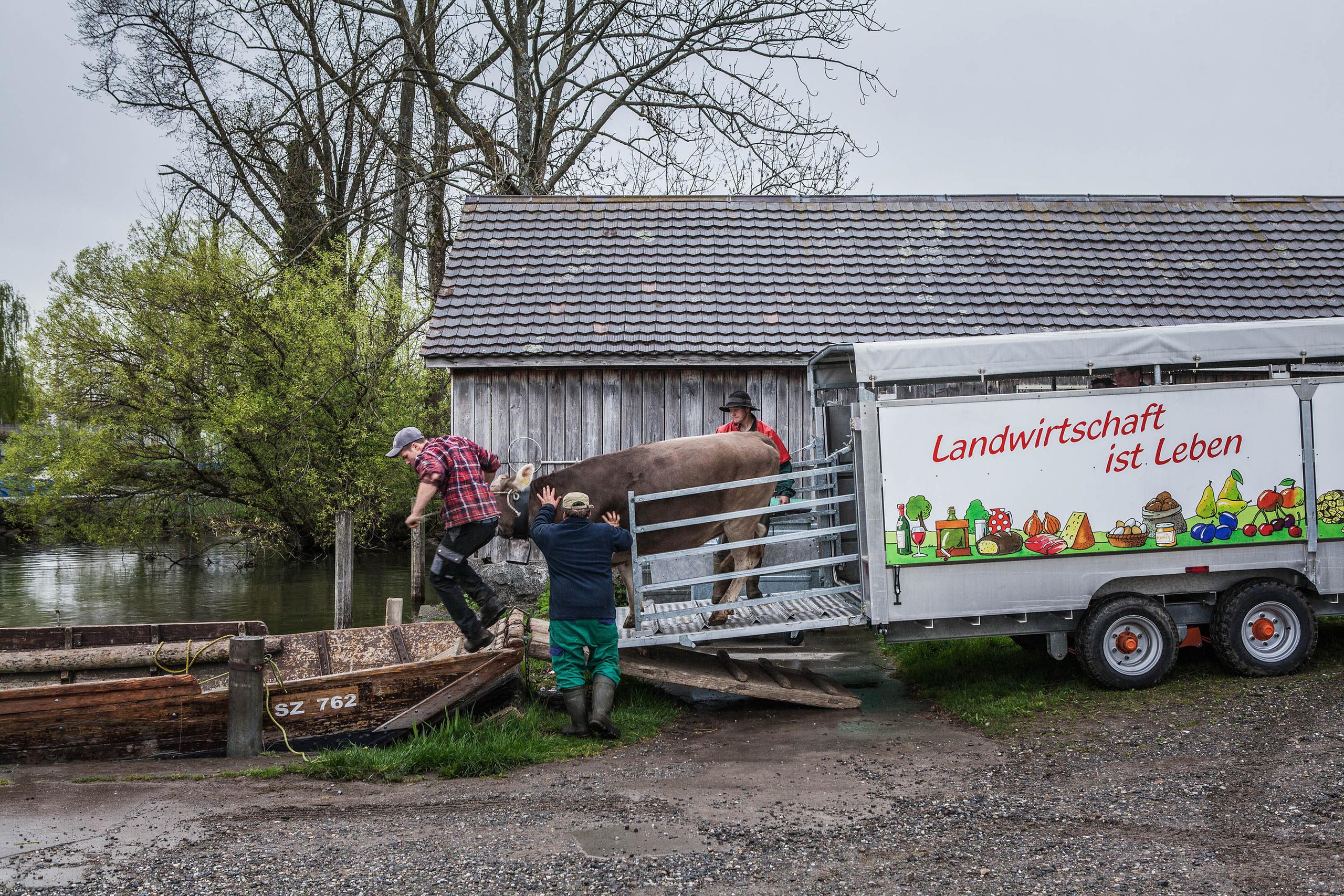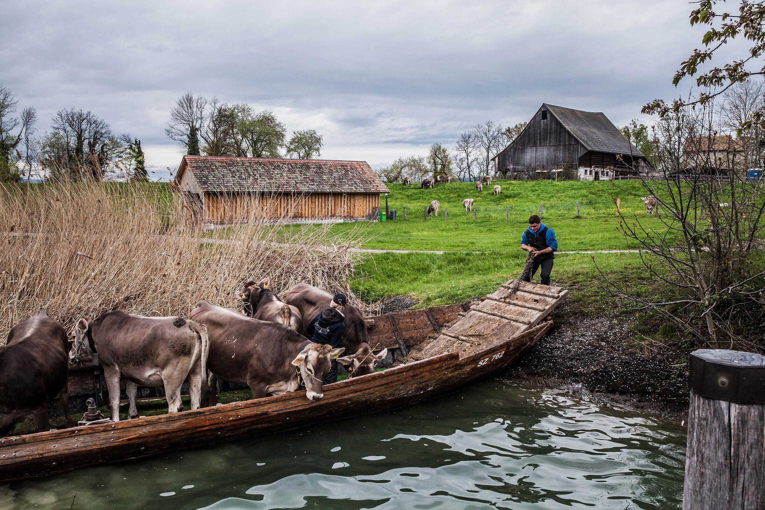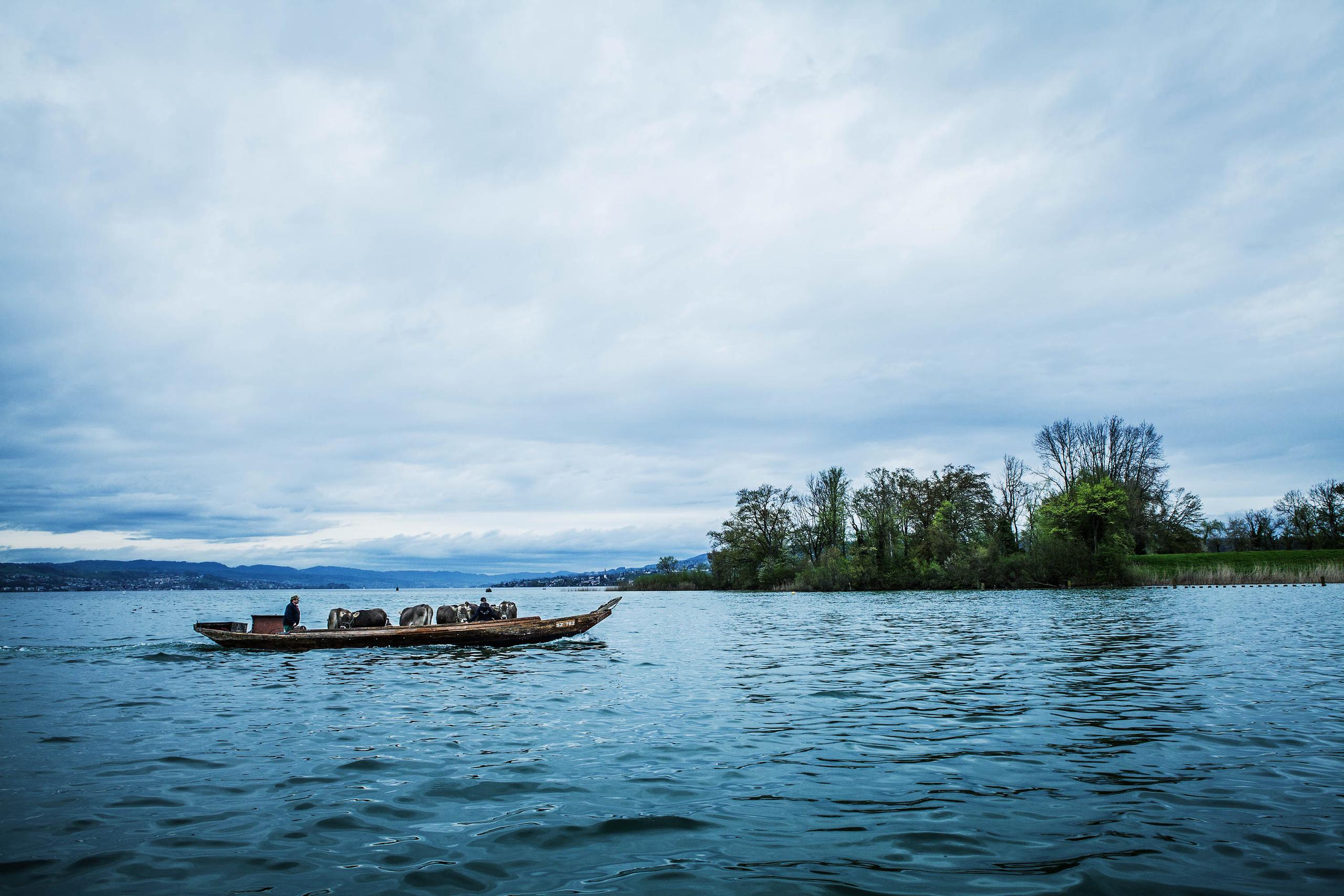 毎年4月の始めになると農夫ヨーゼフ・ヘッキーさんの牛たちは、シュヴィーツ州プフェッフィコンからチューリヒ湖に浮かぶスイス最大の島、ウーフェナウ島外部リンクへ移動する。移動はもちろん唯一の交通手段である船だ。面積11万平方メートルのこの島で牛たちは5月末まで過ごす。