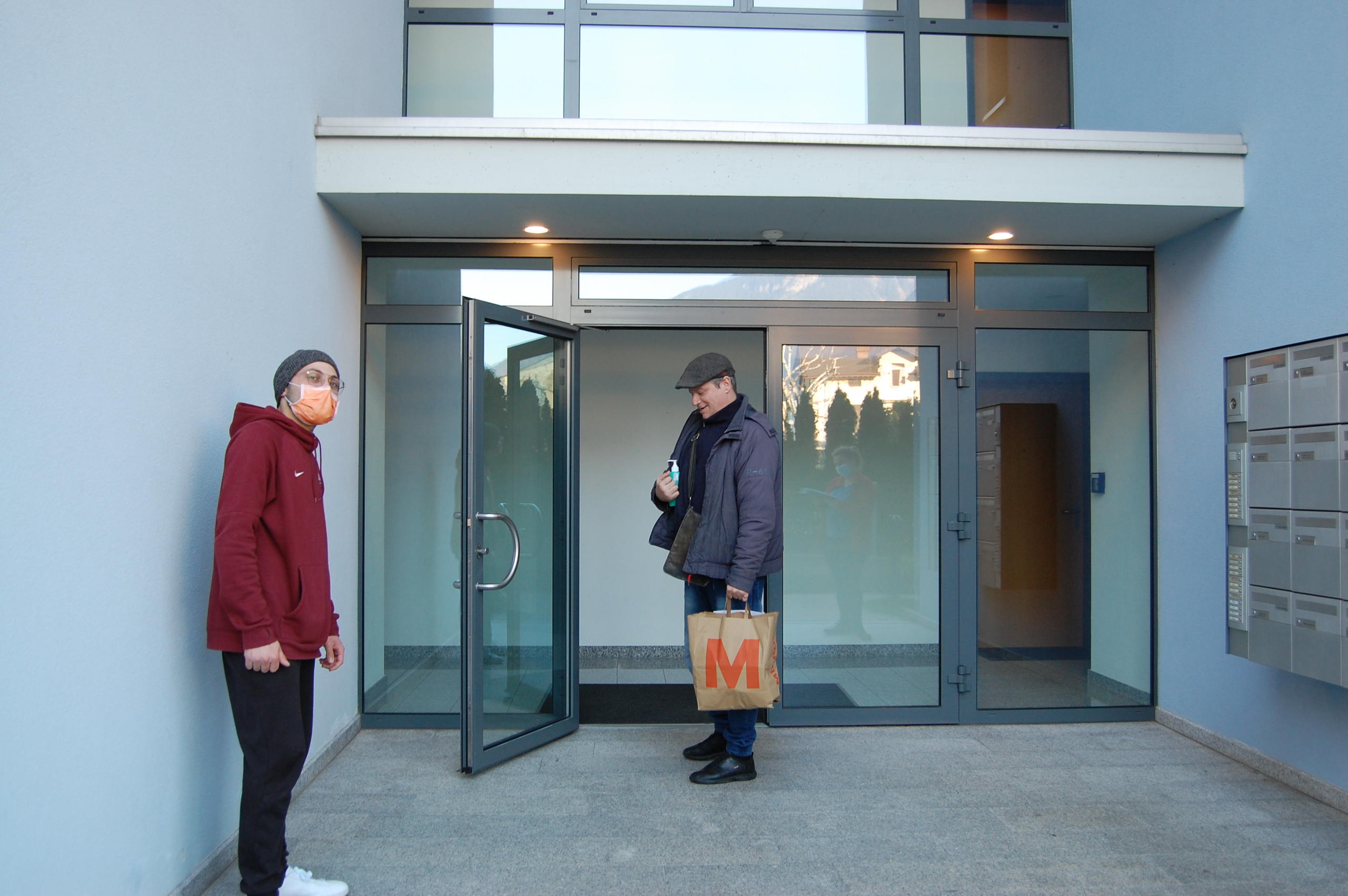 アリンさんとアレッサンドロさんは、スイス南部・ティチーノ州のベリンツォーナのスイス在宅ケア協会(シュピッテクス)に勤める実習生だ。新型コロナウィルスの世界的な流行を受け、高齢者や感染リスクの高い人に食料品を届ける代行サービスを担当している。このサービスは、市が無料で提供している。