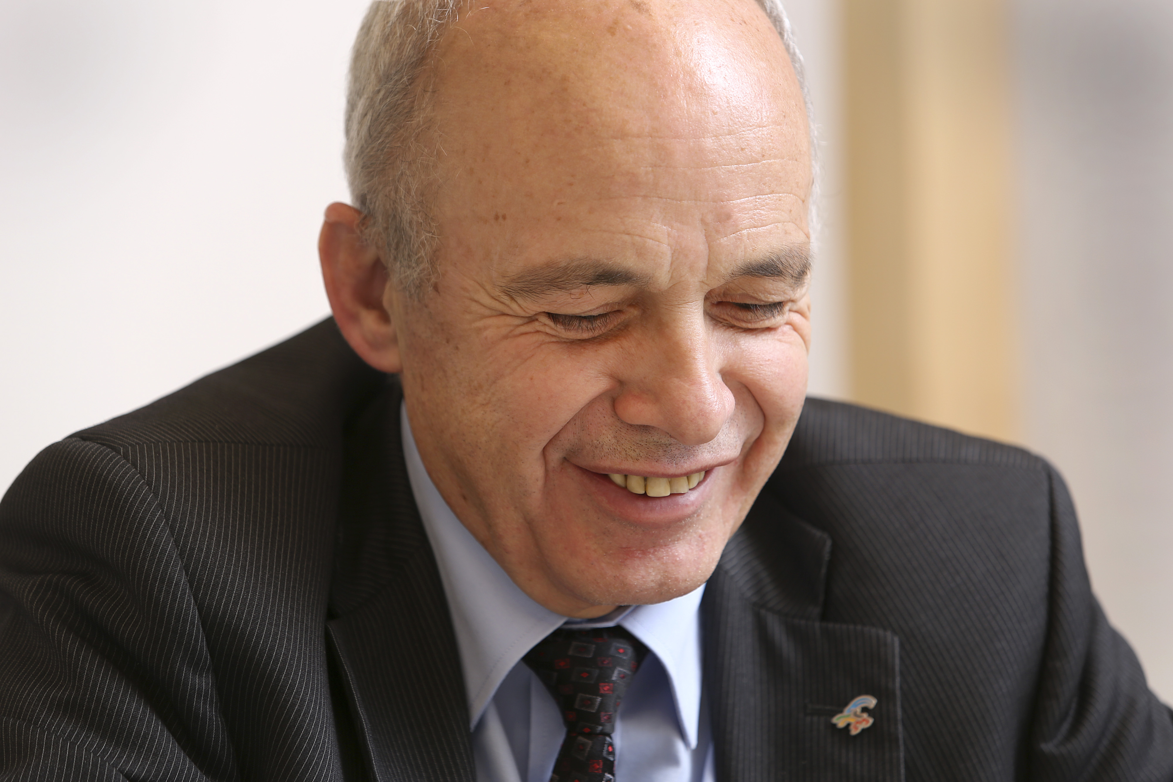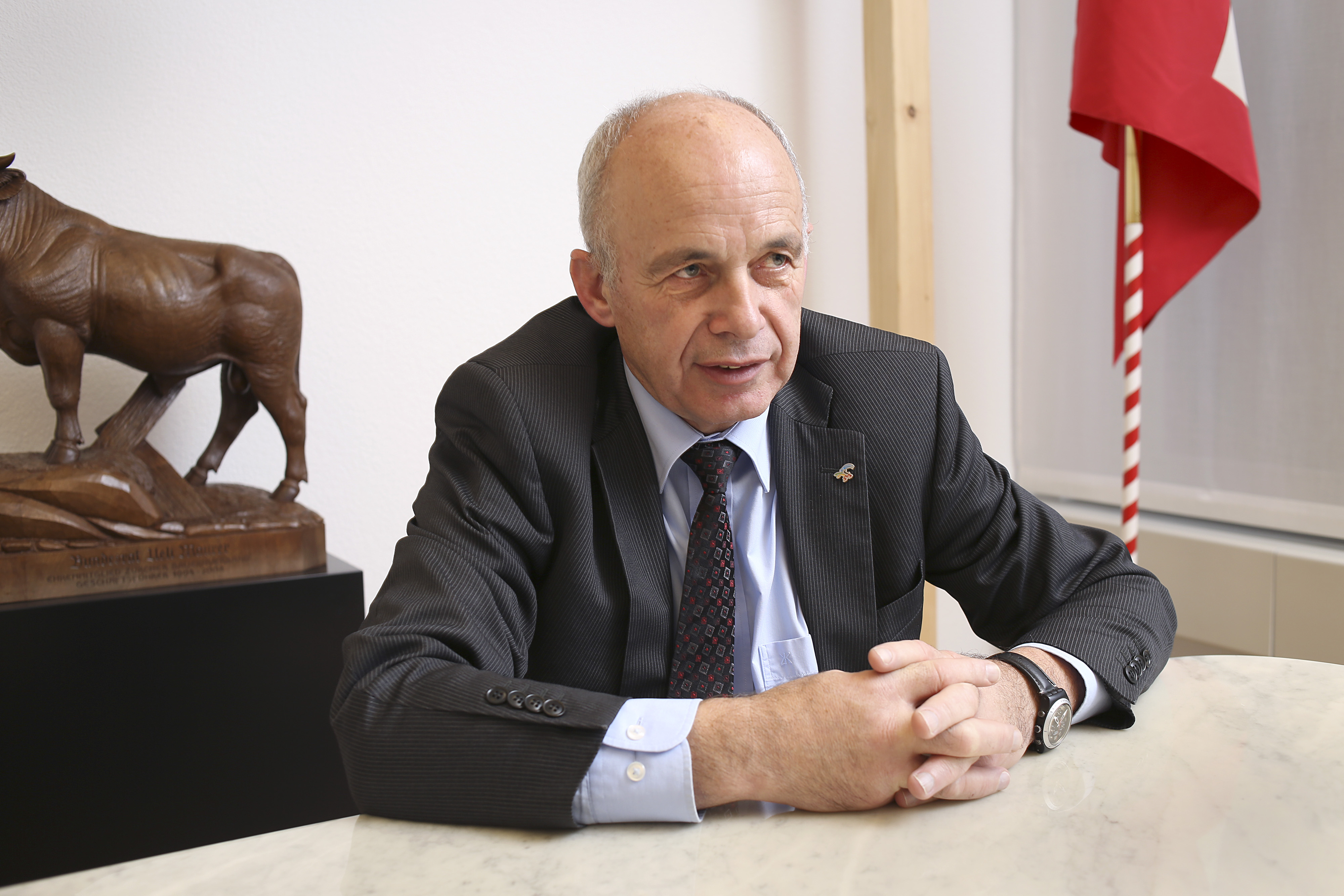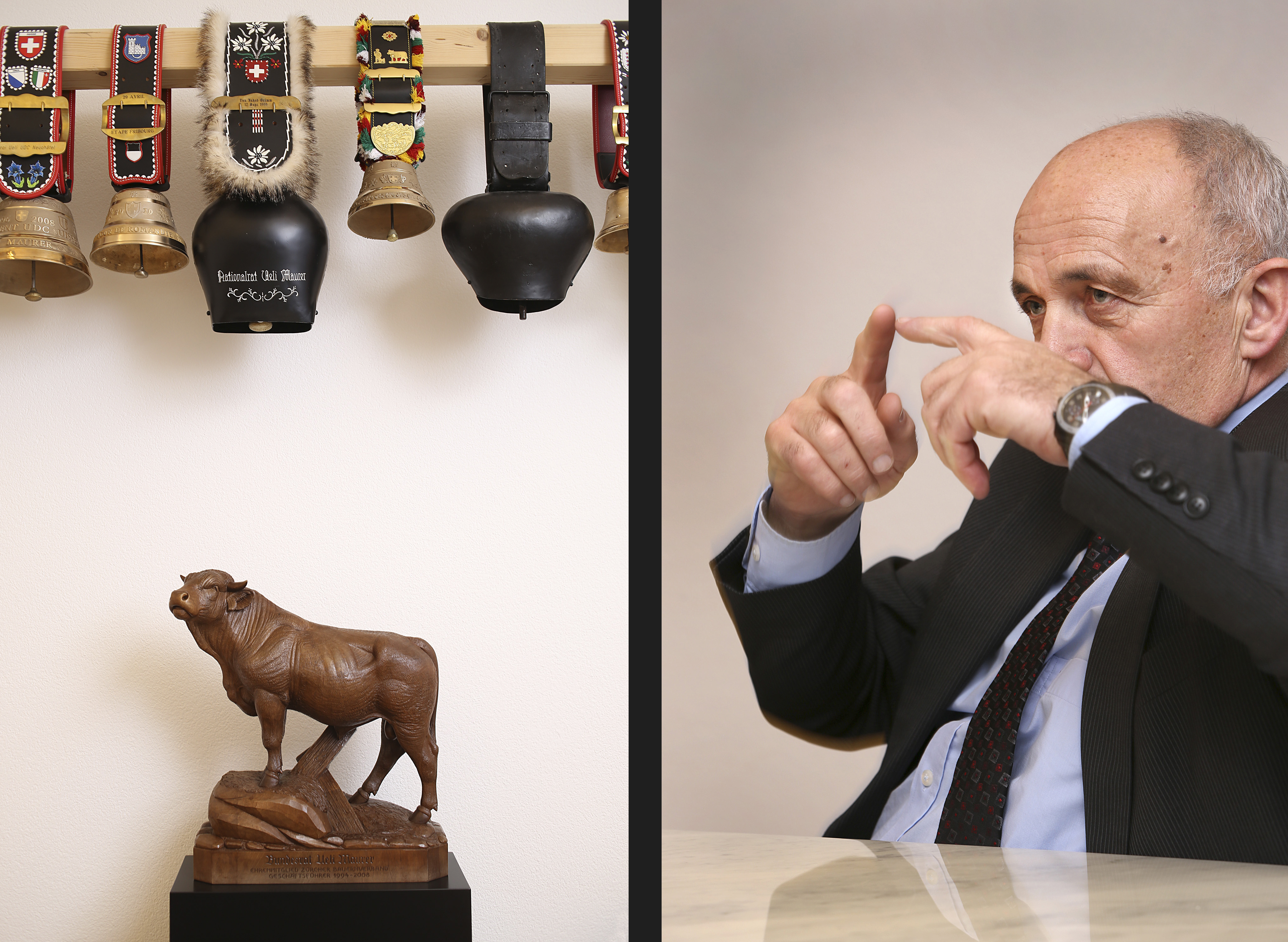 ウエリ・マウラー大統領は、思い出の品とスイスの地方のシンボルに囲まれて仕事をしている。写真家トーマス・ケルンさんのカメラに収められたのは連邦大統領だけではない。