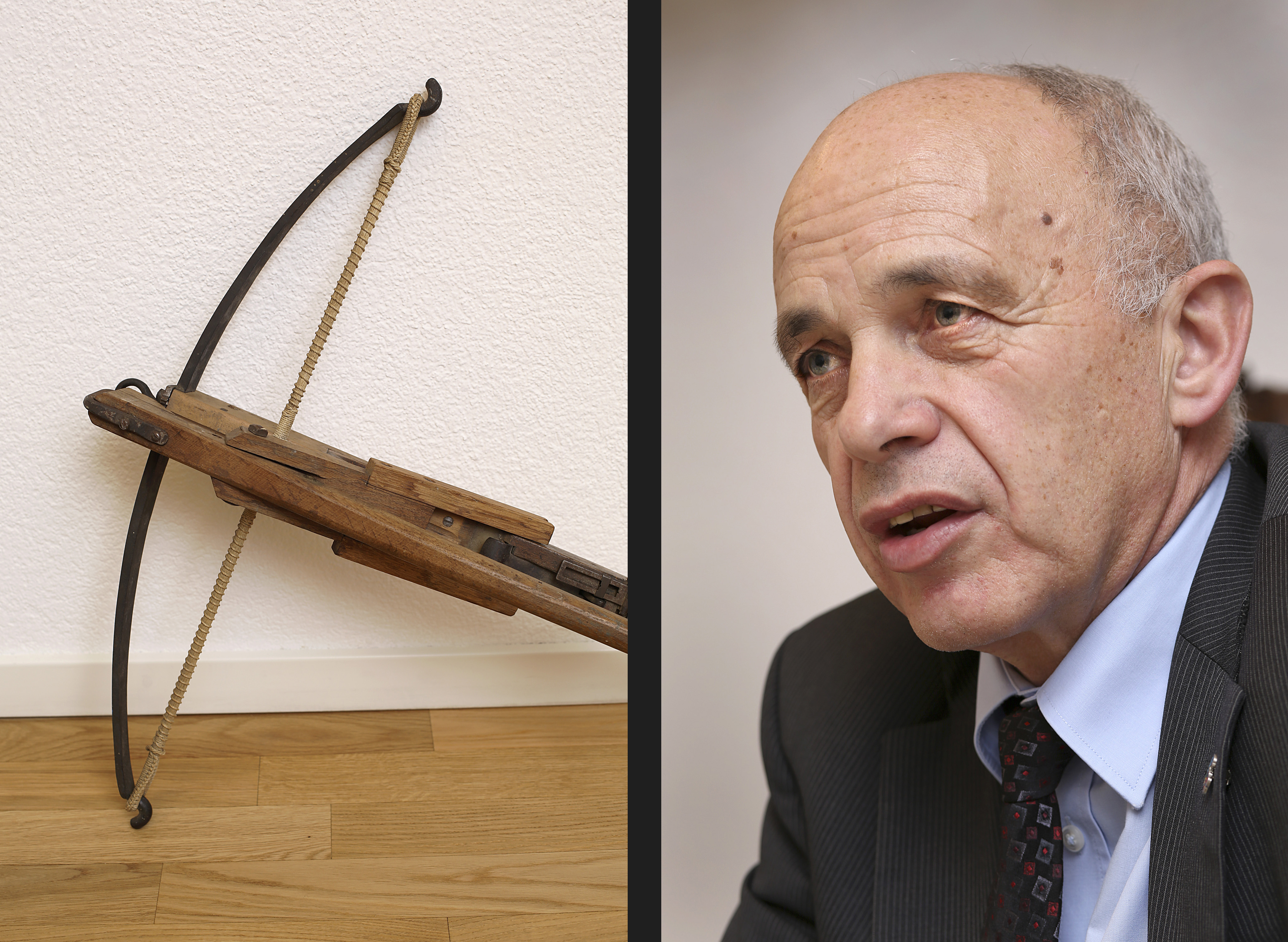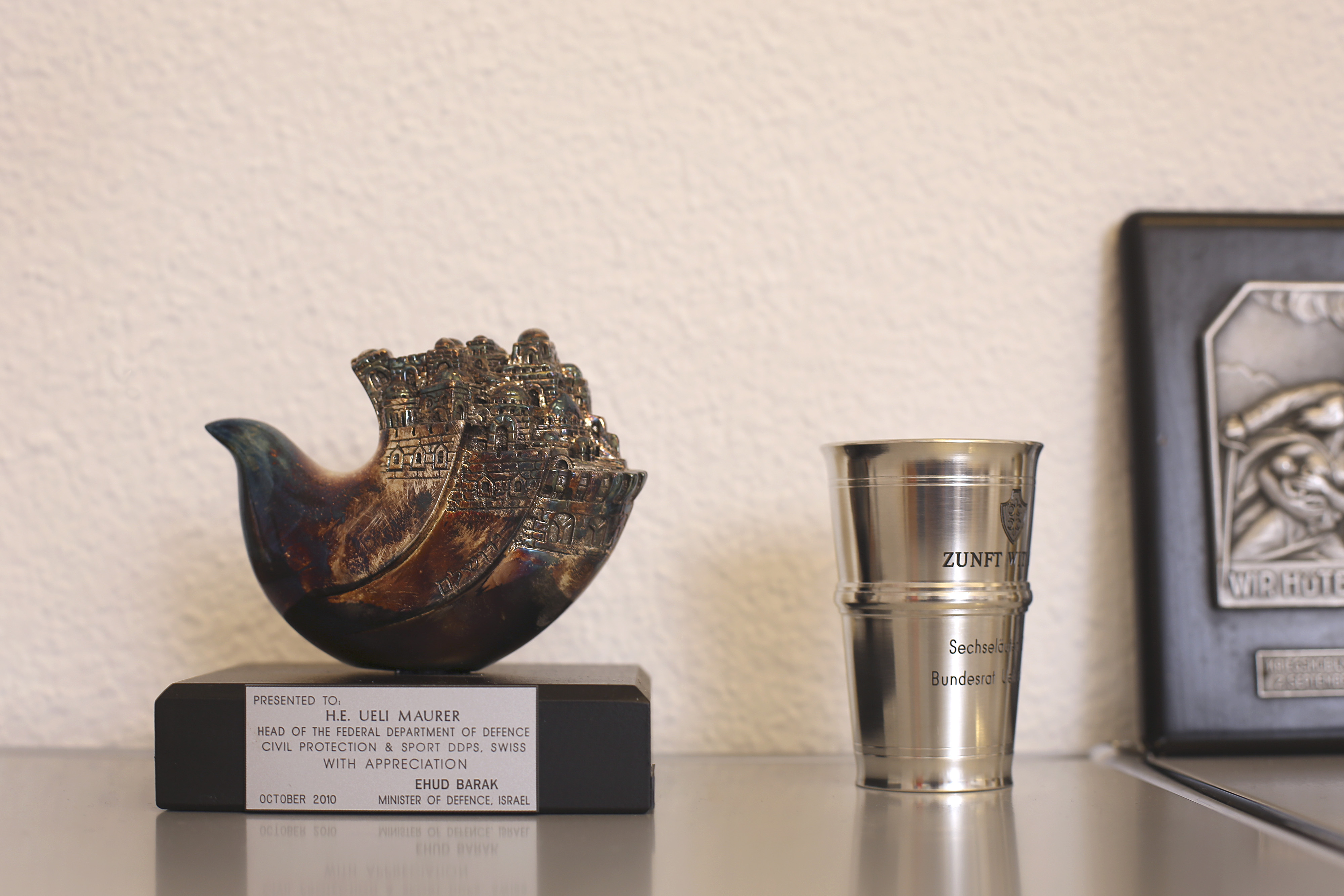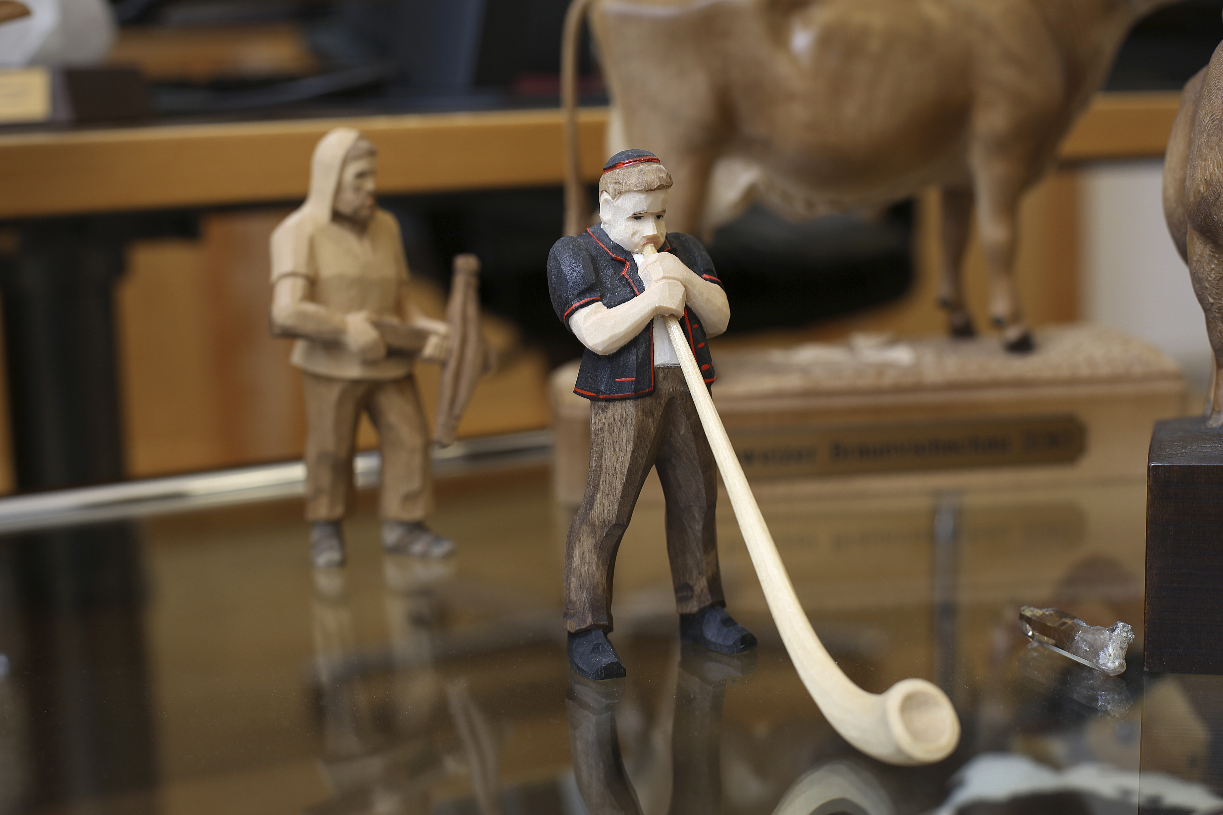 木製ミニチュア人形のアルプホルン奏者と牛、カウベル、そしてスイスのシンボル、石弓。これは大統領のオフィスの様子だ。