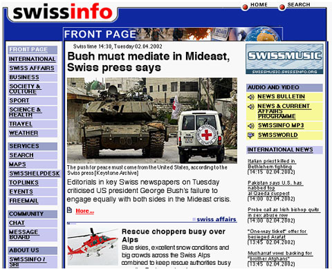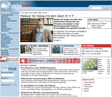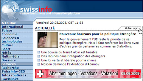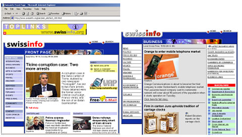憶えていますか?こんなレイアウトの時もありました・・・。ご覧いただく中には、今は無きコンテンツを再発見していただけるかもしれません。懐かしい過去のページをめくりながら、swissinfo.chの進化の過程を振り返ってみてください。