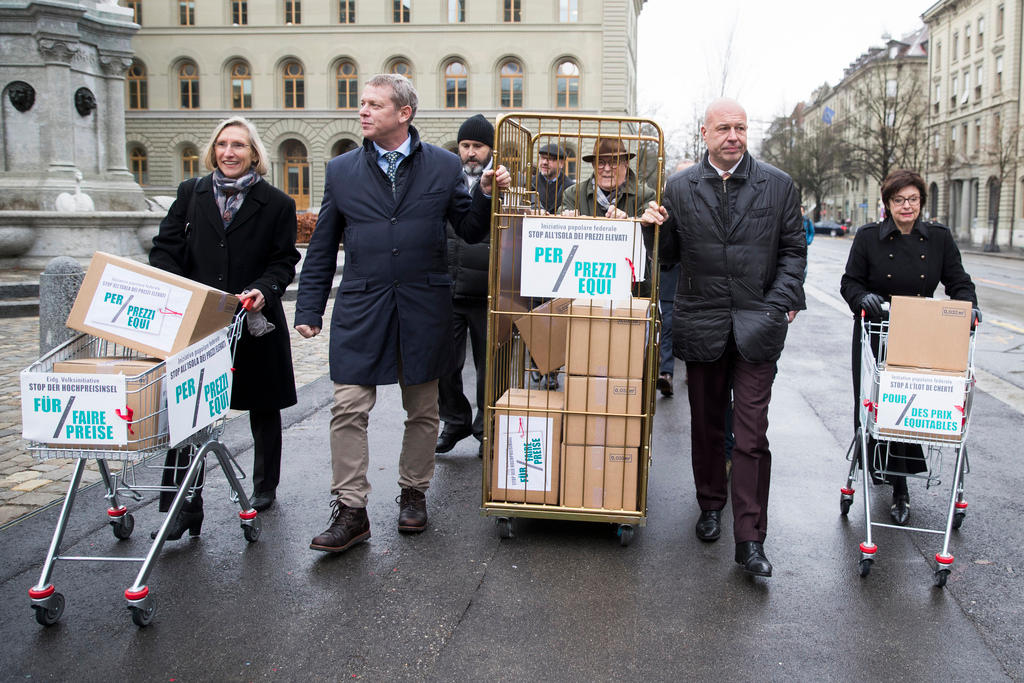 スイスの消費者団体らは12日、国内の消費財の価格が高すぎるとして、是正を求めるイニシアチブ(国民発議)を連邦内閣事務局に提出した。この日、関係者が必要な10万筆を超える10万7908筆の署名入りの段ボールを持って、同局に届けた(写真)。今後、国民投票で是非が問われる。