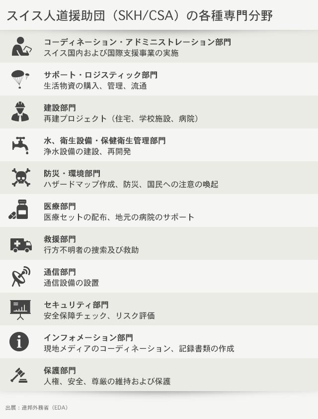 「スイス人道援助団」という組織名は、慈善団体よりむしろ軍隊のような響きがする。実際、軍隊との共通点が一つある。それはこの団体が「民兵制」からなり、普段は一般職業に従事するスイスの民間人が援助団を構成している点だ。