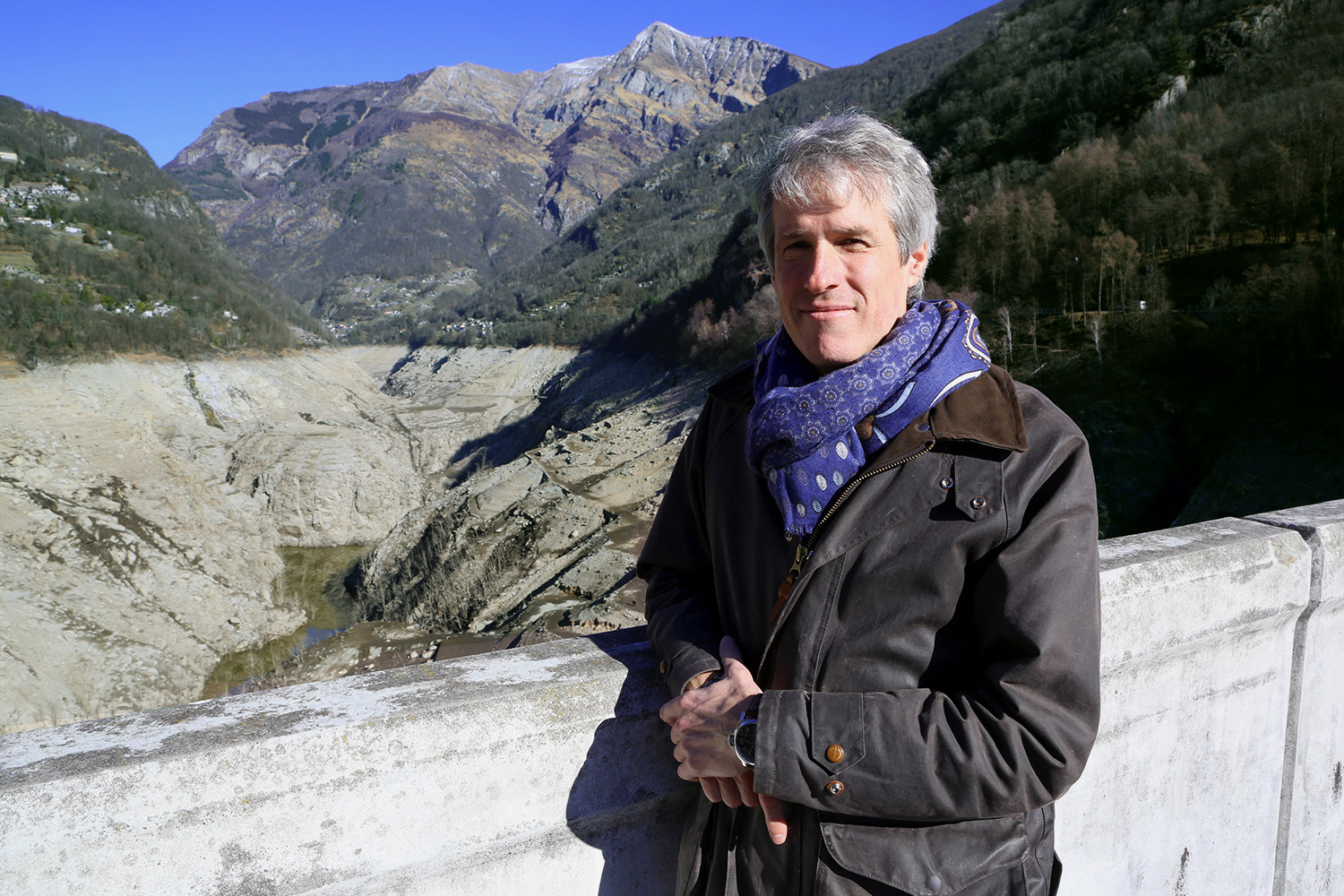 私たちは今、ヴェルザスカ・ダムの堤頂から目の前に広がるダム底を見下ろしている。スイス南部ティチーノ州ロカルノから数キロメートル離れた場所にあるこのダムは、56年間の運用を経て改修工事が必要となった。普段はエメラルドグリーンの水をたたえる貯水池は、現在水を抜かれ、まるで月面のように灰色で不毛な風景と化していた。「ほぼ空の状態で見る貯水池は、ある意味でインパクトがある」とアンベルク氏は言う。