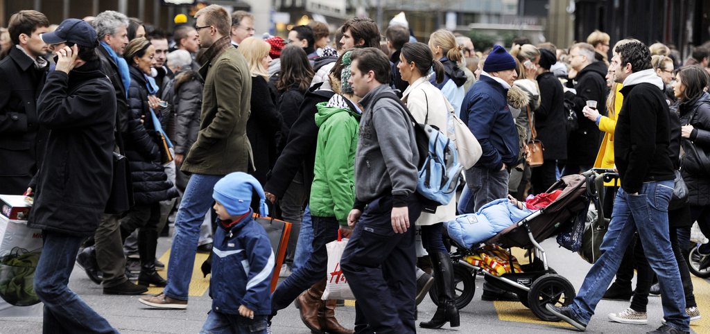 ショッピングをする人でにぎわうチューリヒの街中 Keystone