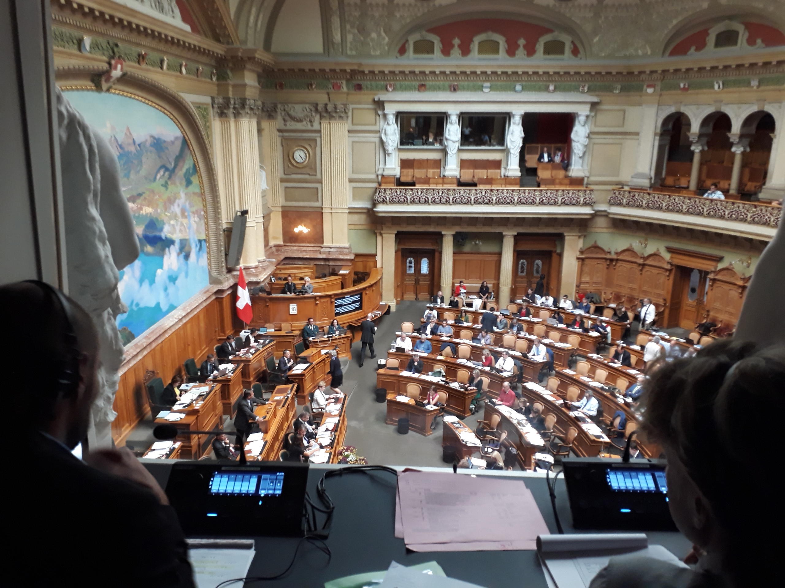 同時通訳は1948年初めに国民議会(下院)でドイツ語とフランス語が導入された。コスト上の理由により、イタリア語は2004年だった。