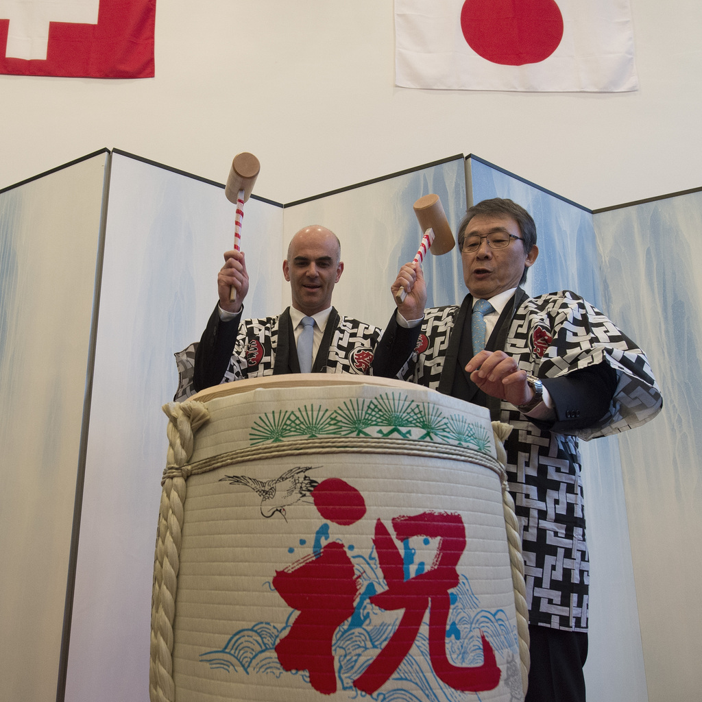 日本・スイス国交樹立150周年の諸行事の幕開けにスイスのベルンで25日、日本大使館主催の公式レセプションが開催された。元宝塚月組組長の越乃リュウさんが朗々と両国の国歌を歌い上げた。その後、日本の前田隆平駐スイス大使とスイスのアラン・ベルセ内務大臣は、両国の友好溢れる150年の歴史と今後のさらなる交流を願い、小槌を振り上げ酒樽を割った。