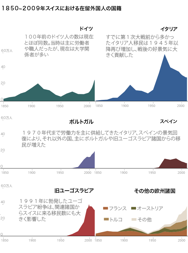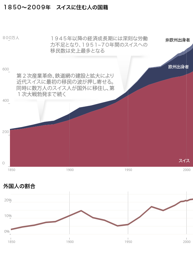 スイスは今日、外国人比率の最も多い国の一つでもある。また、スイスに住む4人に1人は外国生まれだ。