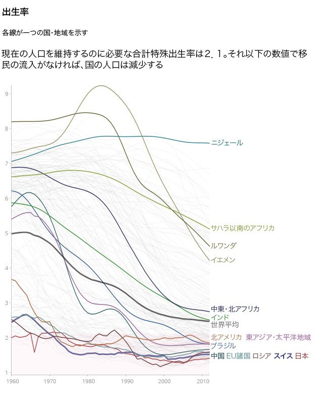 1人の女性が一生の間に産む子どもの数(合計特殊出生率)も過去50年間で劇的に減少し、世界平均では5人から2.5人に減った。スイスでは、ベビーブームの合計特殊出生率は2.5人だったのが現在は1.5人。これは、現在の人口を維持するのに必要な合計特殊出生率の数値を下回る。死亡数が出生数を上回っているので、このままではスイスの人口が減少するかもしれない。だが流入する移民の数は人口維持に十分すぎるぐらい多いため、その心配は無用かもしれない。