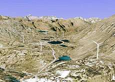 高さ78メートルの風車8基を建てる費用はおよそ4800万フラン ( 約48億円 ) という。2009年までに標高2040メートルから2131メートルのゴッタルド峠に建設される予定だ。