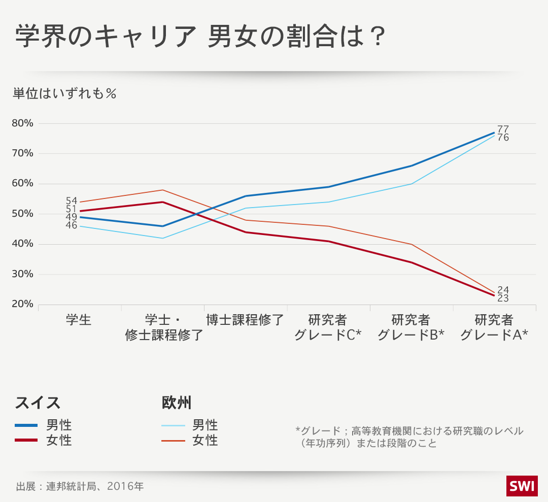 スイス連邦統計局の「女性と科学」に関する統計外部リンクが、これを証明している。2017年は、大学生だと女性の割合は全体の52%で、学士・修士課程修了時では53%を占める。だが、博士課程修了時になると45%に下がり、中堅の研究員では41%、上級研究職では24%に落ち込む。