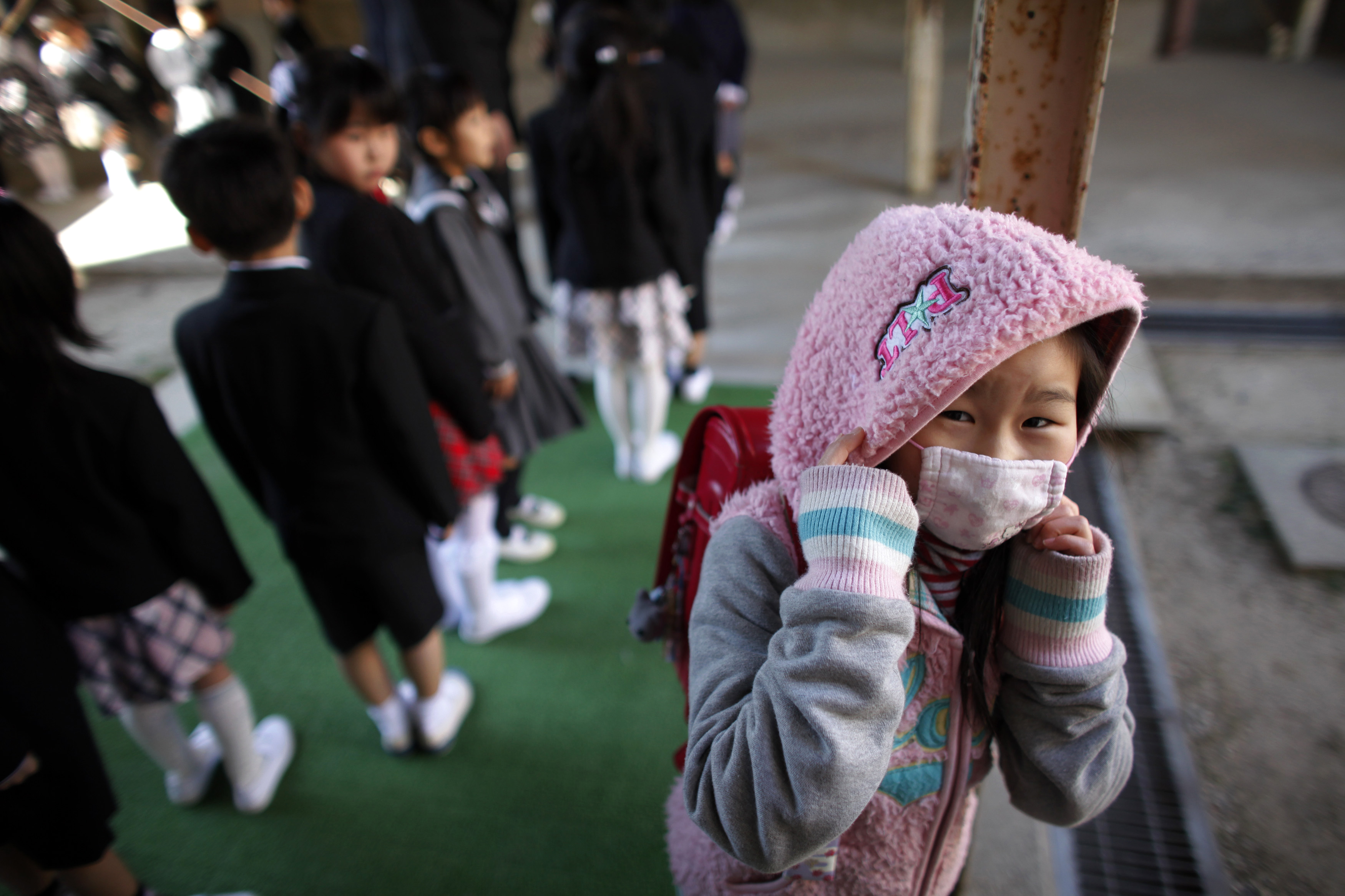 2011年5月、福島市内の学校でマスクをして登校する女子生徒。WHOの報告書でも乳児や子どもの健康被害のリスクは大人のそれに比べずっと高い Reuters