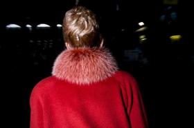 態度を決めかねていたある男性は、自分のコートの縁取りの毛皮が本物か確かめた。フェイクだった。