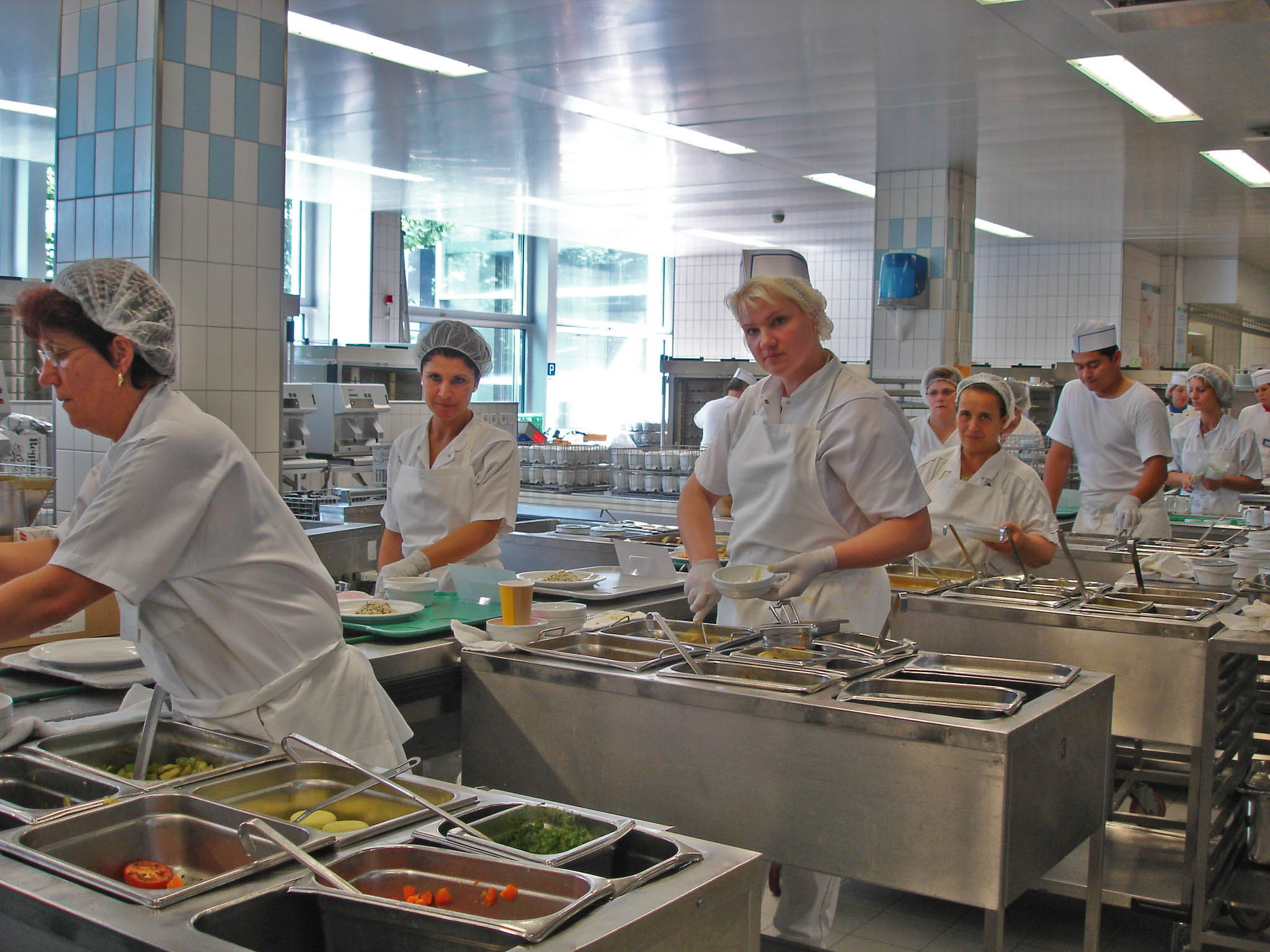 短い髪には小さな帽子で充分だが、長い髪はヘアネットでまとめることが義務付けられている。ベトナム人職員が食事のトレイをまだ何も盛られていない皿と一緒にベルトコンベヤーに載せる。そこへ、スペイン人の同僚がほうれん草を皿に盛りつけ、患者のカルテをすばやく確認した後に米を付けたし、患者の昼食を用意する。
