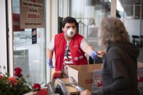 ゼラニウムのない春なんて考えられない?ホームセンターに来た女性のお目当ての商品は視線のすぐ先にある。だが店内の人数を制限するため、従業員から整理券が配られた Gian Ehrenzeller/Keystone