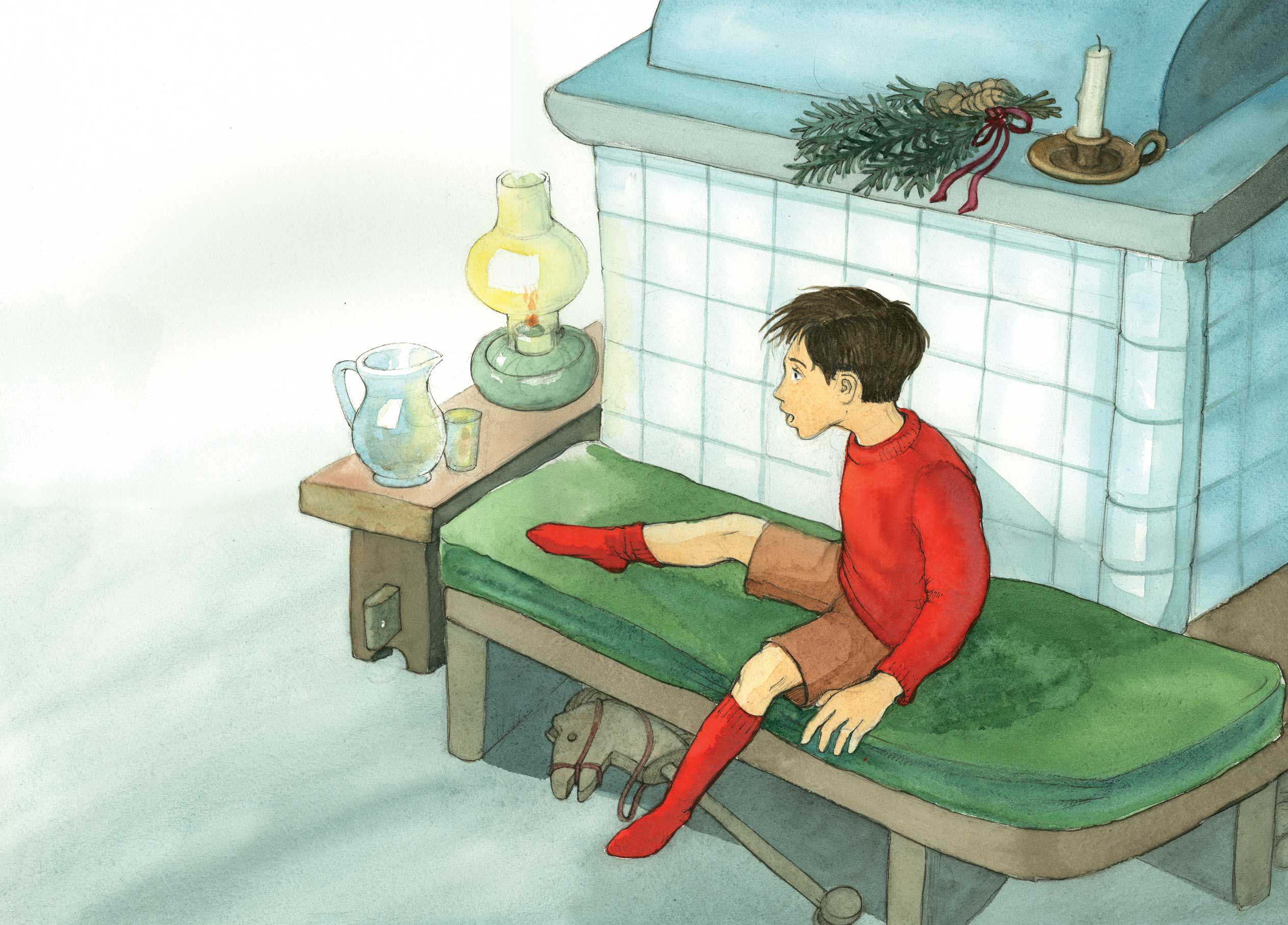 「それはクリスマスの夜のことでした。牡丹雪がしんしんと降り積もり、村中、家の屋根は真っ白な雪でこんもりと覆われています。ニコリンは、教会でパパとママの横に座りながら、自分のコートと冬の靴をじっと見つめています。心の中で『これでもう、足が冷たくなることはないぞ』と満足げに思いました。