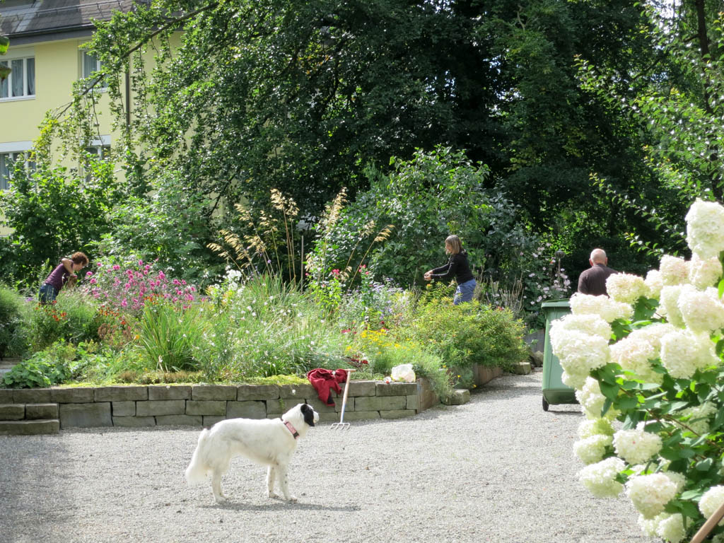 一緒に暮らす集合住宅なのだからもっと多くの人が庭仕事に参加してもいいのでは?との質問に、「僕は生け垣の剪定(せんてい)が任務。でも今日はやらない。たばこを吸っている彼女はイベント企画が仕事だから庭での仕事はしない」とペーターさん。働いている人もそうでない人も皆納得しているからか穏やかな雰囲気が流れている。
