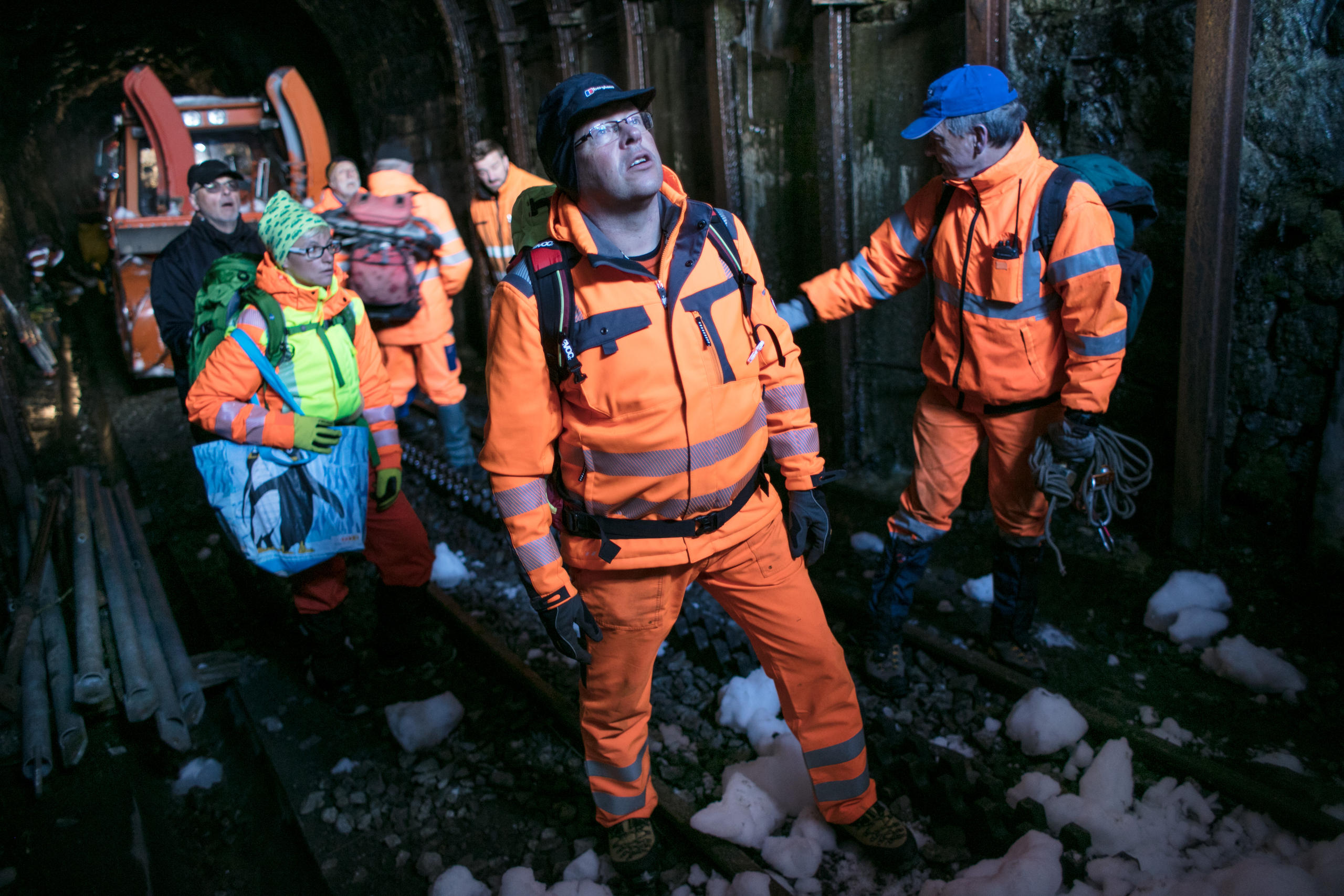 そこから雪の層の上に這い上がるには、はしごだけが頼りだ。雪崩があった場所では、雪の厚さが16メートルにも及ぶことがある。ボランティアたちは2台の除雪機の助けを借りながら、シャベルを使って手作業で雪の層を取り除かなければならない。ディーゼル機関車の前部にも雪を削るフライス盤がついているが、1.5メートル以上の厚みがある雪には使えない。
