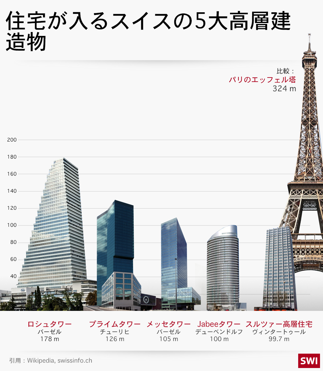 スイスの都市・都市圏を見ると、4、5階以上(スイスでは日本の1階が地上階、2階が1階と呼ばれる)の高層住宅はほとんど見られない。これは、20世紀初頭に高層建築物が目立ち始めた米国や非欧州諸国とは対照的だ。