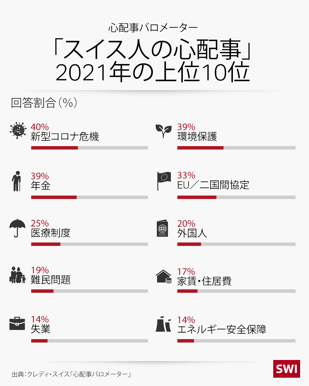 クレディ・スイスによる2021年版「心配事バロメーター外部リンク」では、世論調査機関gfs.bernがスイス全体の有権者1722名を対象に7〜8月に調査を実施。標本誤差は±2.3%ポイント。