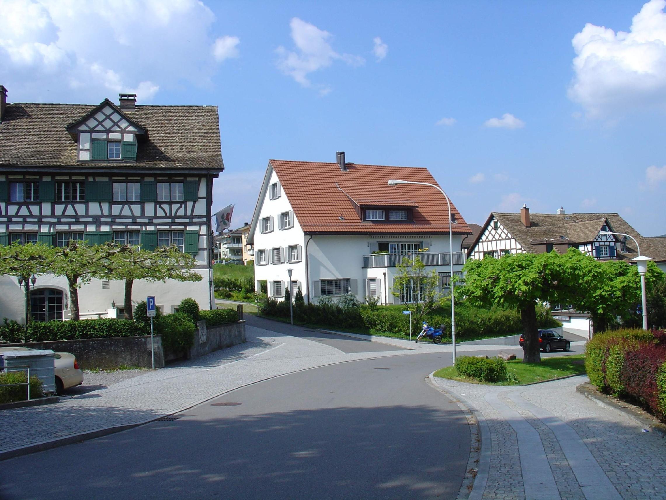 リューシュリコンは丘の斜面に広がる村で、高級住宅地は湖畔または丘の頂上だ。丘の上からは湖が見えて景色が良い。