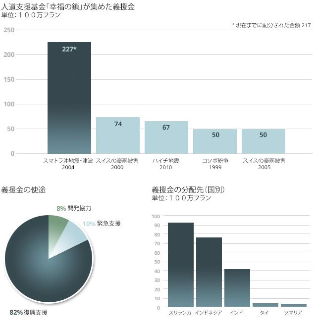 スイスでも津波に対する反応は異例だった。スイスの人道支援財団「幸運の鎖外部リンク」だけでも、2010年のハイチ地震で集まった金額の約4倍に当たる2億2700万フランの募金が集まった。