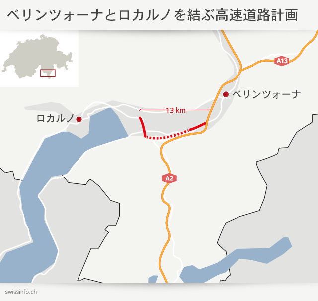 ロカルノ周辺の自治体は数十年前から、A2への「出入口」であるベリンツォーナへとつながる高速道路の建設外部リンクを要求している。