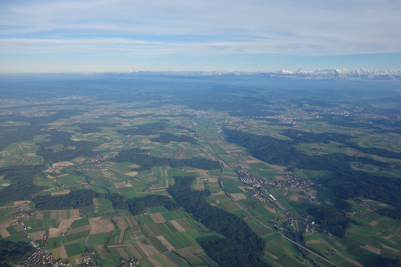 気球は順調に上昇を続け、高度2000mに到達。恐る恐る下を覗き込むと、非日常的な高さを肌で実感して足がすくんだ。遥か遠方には、ベルナーオーバーランドの素晴らしいアルプスの山並みが雲の上に浮かんでいるように見えた。熱気球は風と同じ速度で移動するため、上空でもほとんど風を感じないのが特徴だ。時折、ゴーッと焚かれるバーナーの音以外は一切無音。炎の熱気のせいで寒さも特に感じない。炎下にいるパイロットはTシャツ一枚だ。
