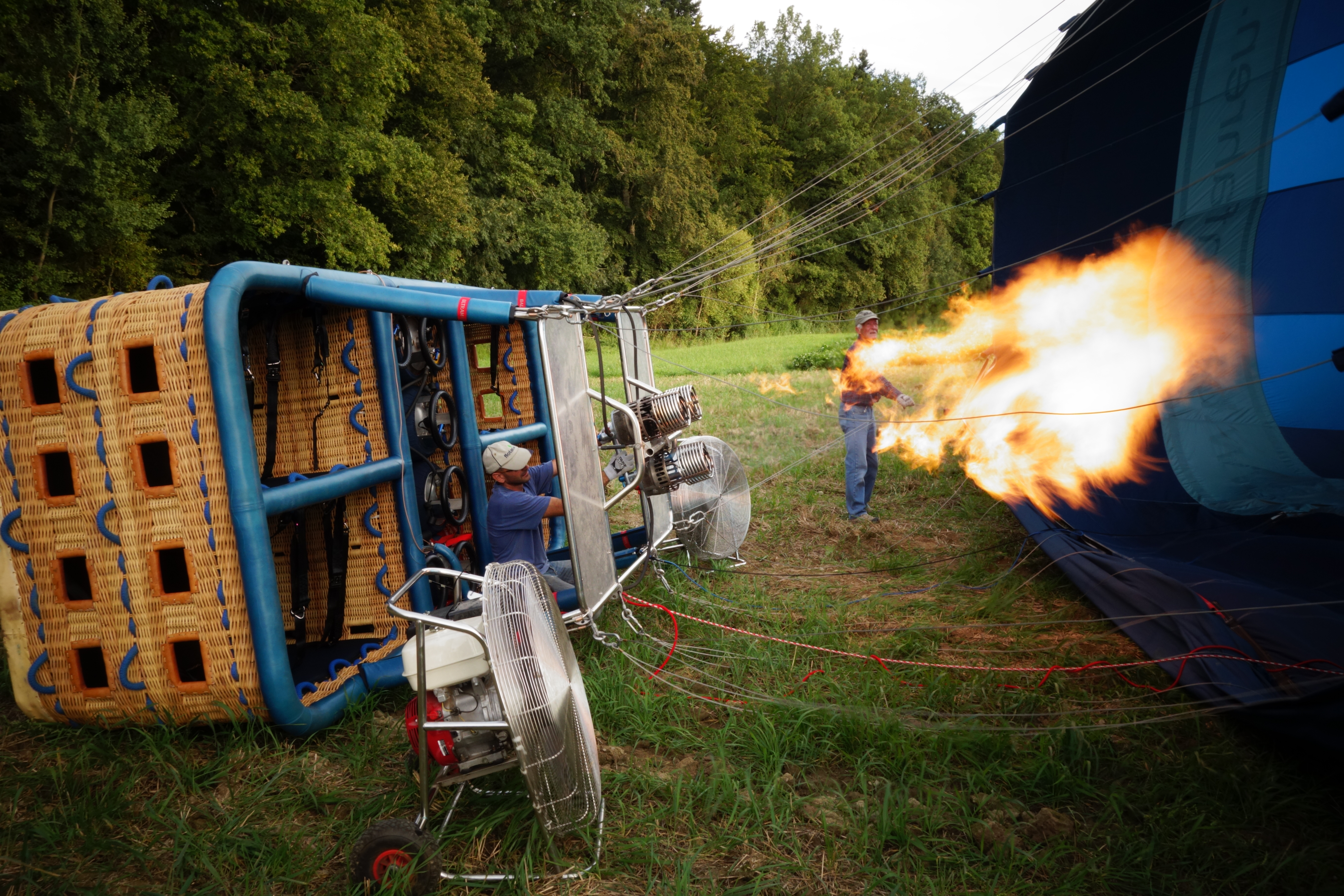 飛行当日は、まさに抜けるような青空で理想的な弱風が吹いていた。場所はスイス北西部のハルデルン(Hardern)というベルン州にある小さな農村である。この日熱気球飛行に参加するために集まった乗客は老若男女あわせて14人。昼間は上昇気流の影響で飛行が不安定になるため、飛行時間帯は朝夕に限られている。今回は夕方5時半からの飛行を予約した。